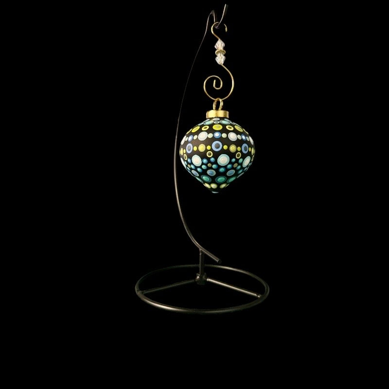 Lunar Glow is a hand dot-painted drop-shaped ornament with a black base and accents of teal, blue, lime, yellow-green, and dark gray. Its glowing dots scatter like tiny moons across the surface, adding a playful yet celestial charm to any space.