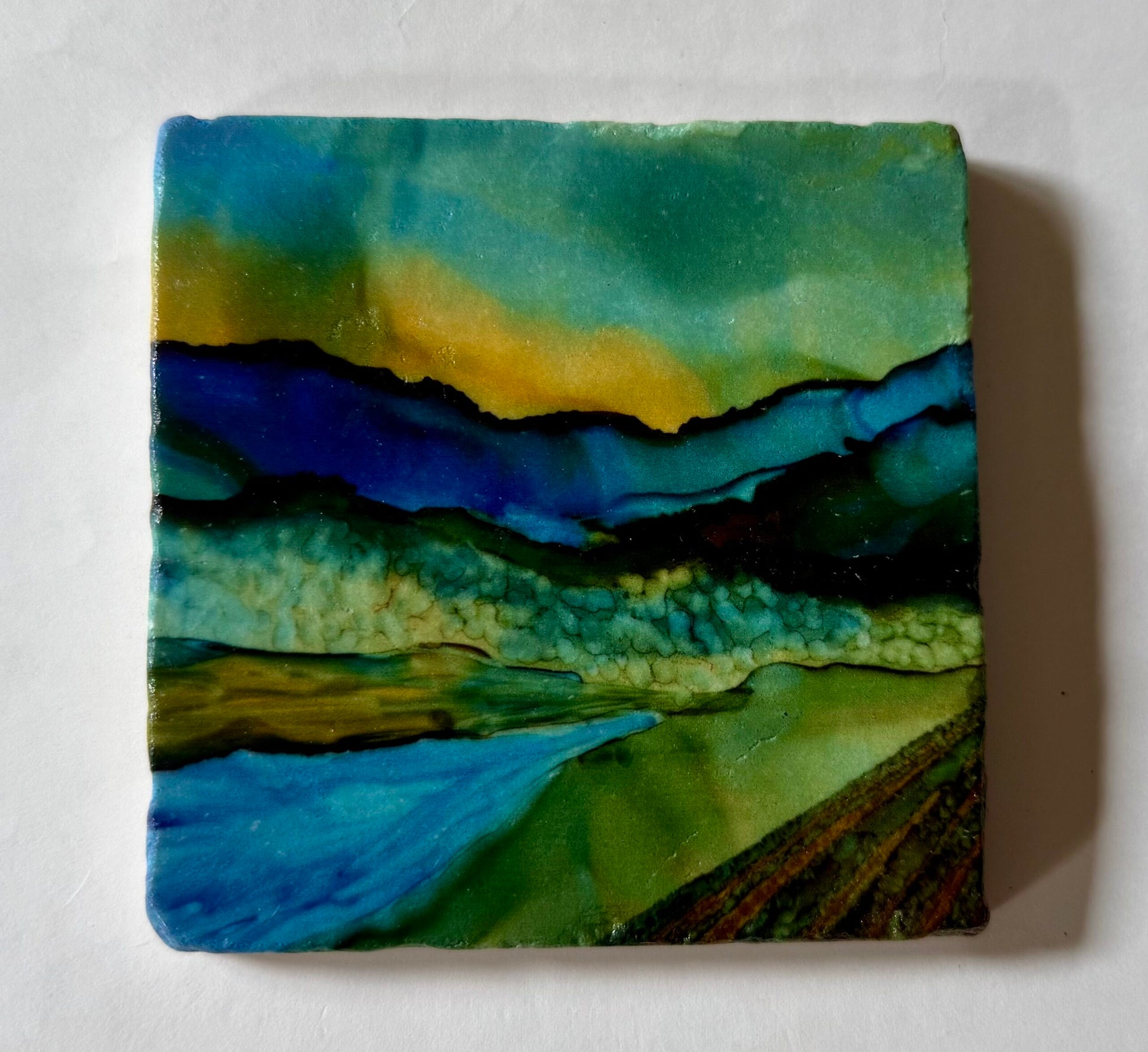 I designed this unique coaster with my favorite painting so far this year and had it specially printed on marble to serve as a heavier duty 4" x 4" coaster. With a sturdy cork backing this is created to last. Edges are slightly textured, painting wraps around the edge for a natural blend from the design to the natural off-white of the marble. Semi glossy in finish this coaster will not lift from your table with a sweaty glass!