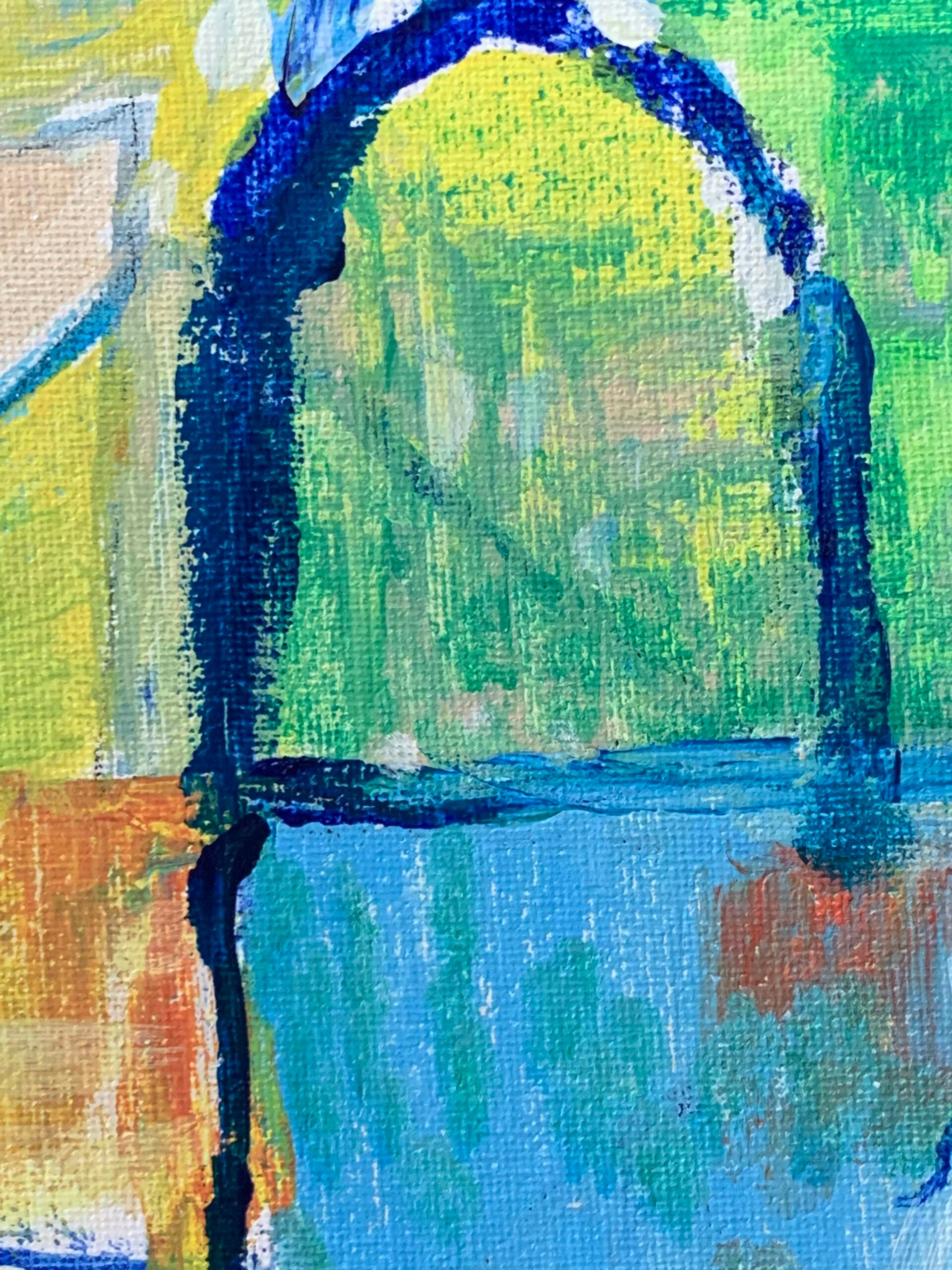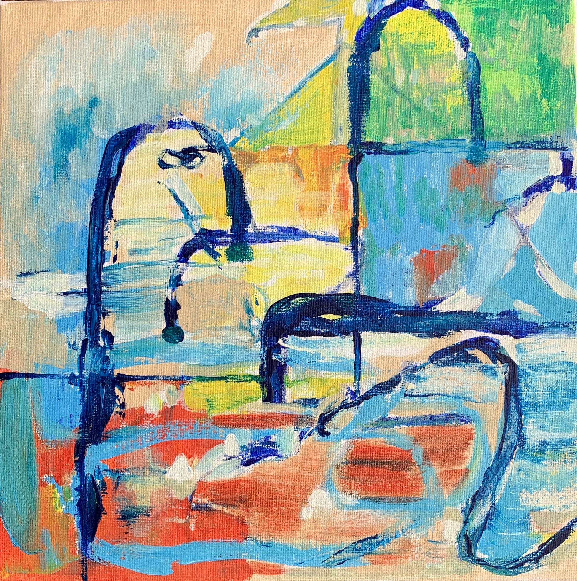 • Square abstract expressionist acrylic painting in green, yellow, burnt orange, deep blue, sky blue, turquoise, white against a warm parchment background.