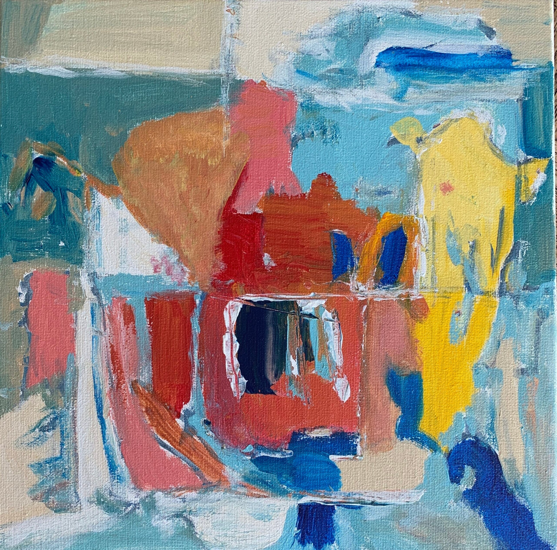 • Square abstract expressionist acrylic painting in deep blue, sky blue, deep turquoise, beige, dusty pink, bright and pale yellow, green, and white against a soft parchment background.