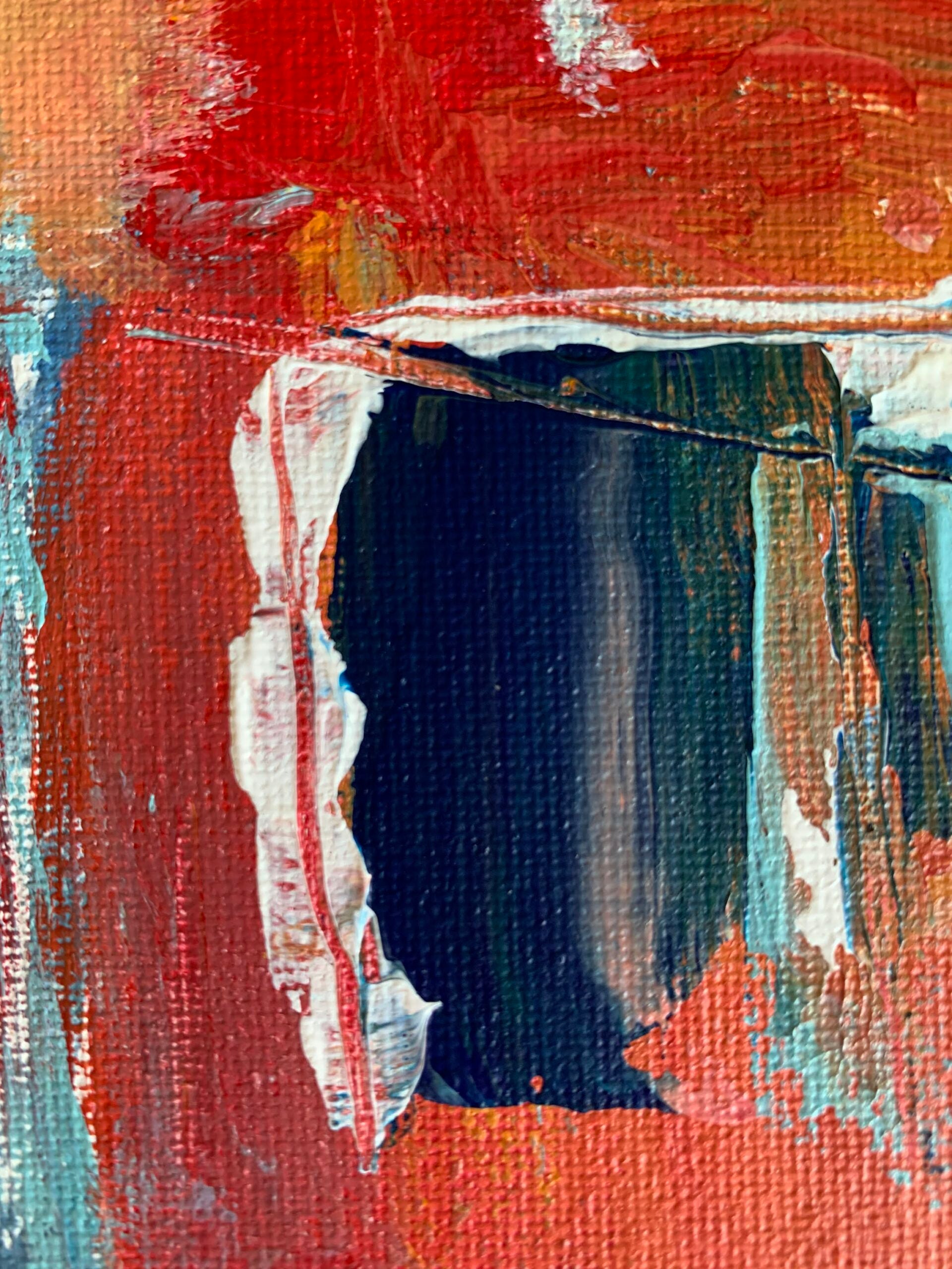This colorful abstract composition is painted in irregular and geometric patches of shapes with undertone color slightly visible. Shapes are defined by varying brushstrokes to create varied textures and detail within the painting. Horizontal brush work is applied to create mirror-imaging effect for key focal points. The painting is unframed, with white painted sides so framing is optional. The artist's signature is on the reverse. Contact Sharon Dee for commissions and inquiries at sharondee1@gmail.com