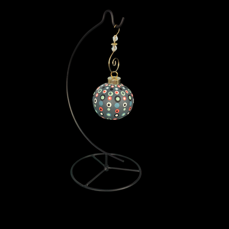 Mod Dots is a hand dot-painted round ornament with a dark gray base and accents of soft mint, blues, black, and white. Its repeating circles echo a playful mid-century rhythm, adding a cool retro touch to any shelf, windowsill, or cozy corner.