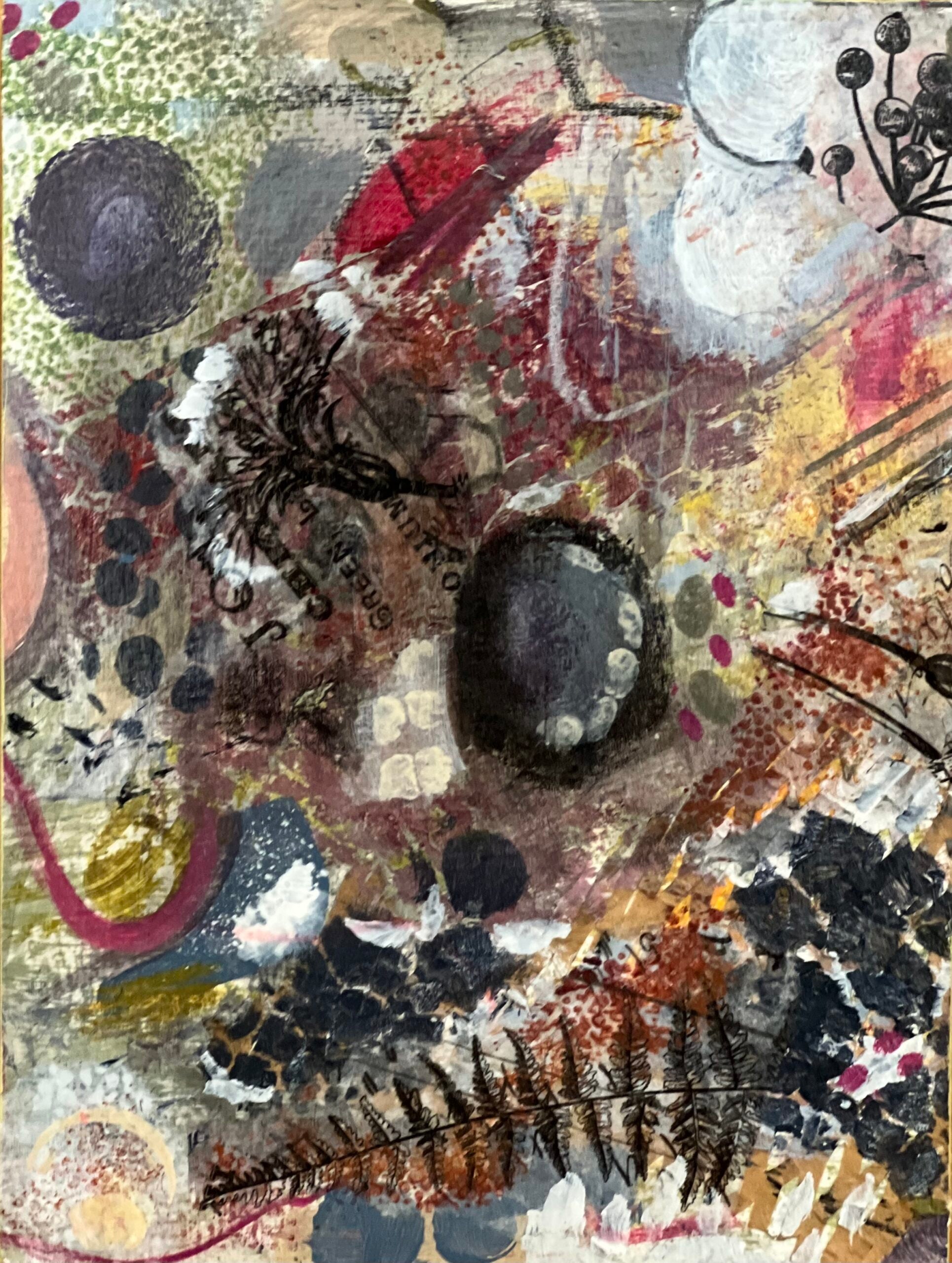 • Mixed media art work on paper, mounted on a 7/8” deep, wood cradle board.