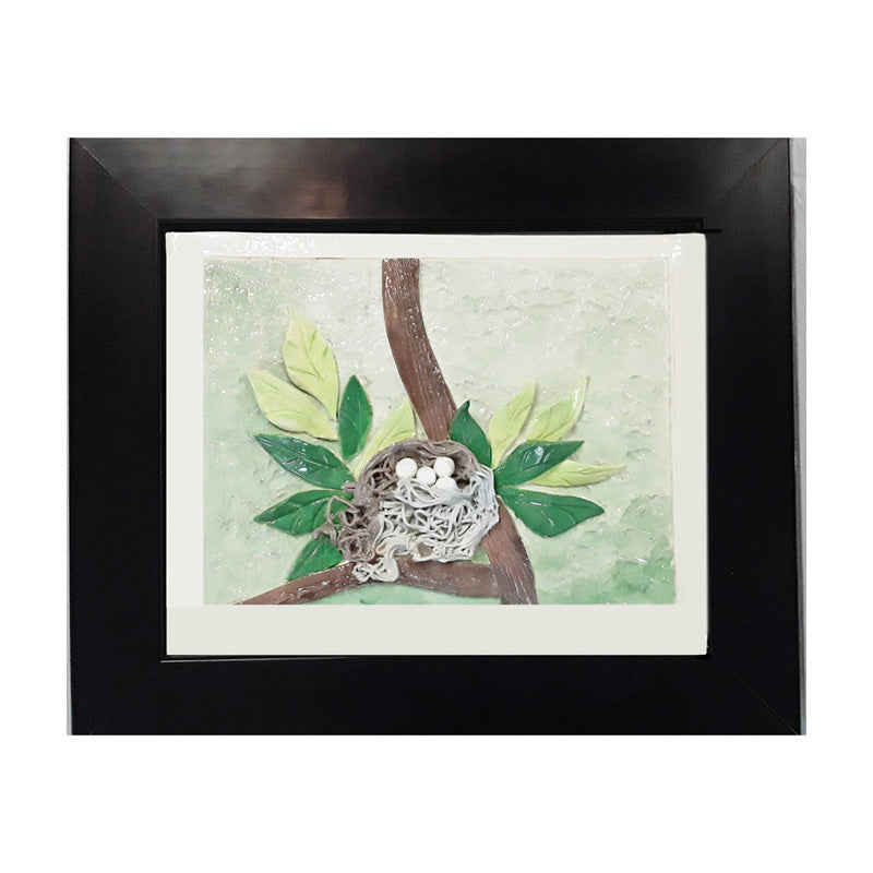 This unique piece captures the delicate charm of a bird’s nest cradling four eggs, nestled within a bough of a tree. Inspired by the tranquil by the natural world, each element is thoughtfully designed and painted using underglaze techniques, adding a touch of vibrant color to the sculpture. Finished with a clear glossy glaze to enhance the colors, mounted on a board and set into a float frame, the piece is recessed, creating a sophisticated display that allows the artwork to stand out. The float frame not only highlights the sculpture but also provides a protective barrier against accidental mishandling.