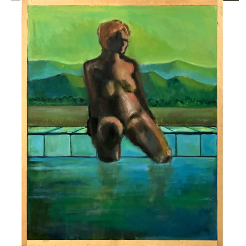 I painted the model for "On The Edge" several years ago. She'd sat on a stool in my studio, and I'd only completed one or two sessions with her. Looking at the unfinished painting recently, I saw how she seemed just at the edge of the stool, almost slipping off. I thought to add the swimming pool, and then mountains in the distance. There's an atmospheric serenity and privacy to the moment.