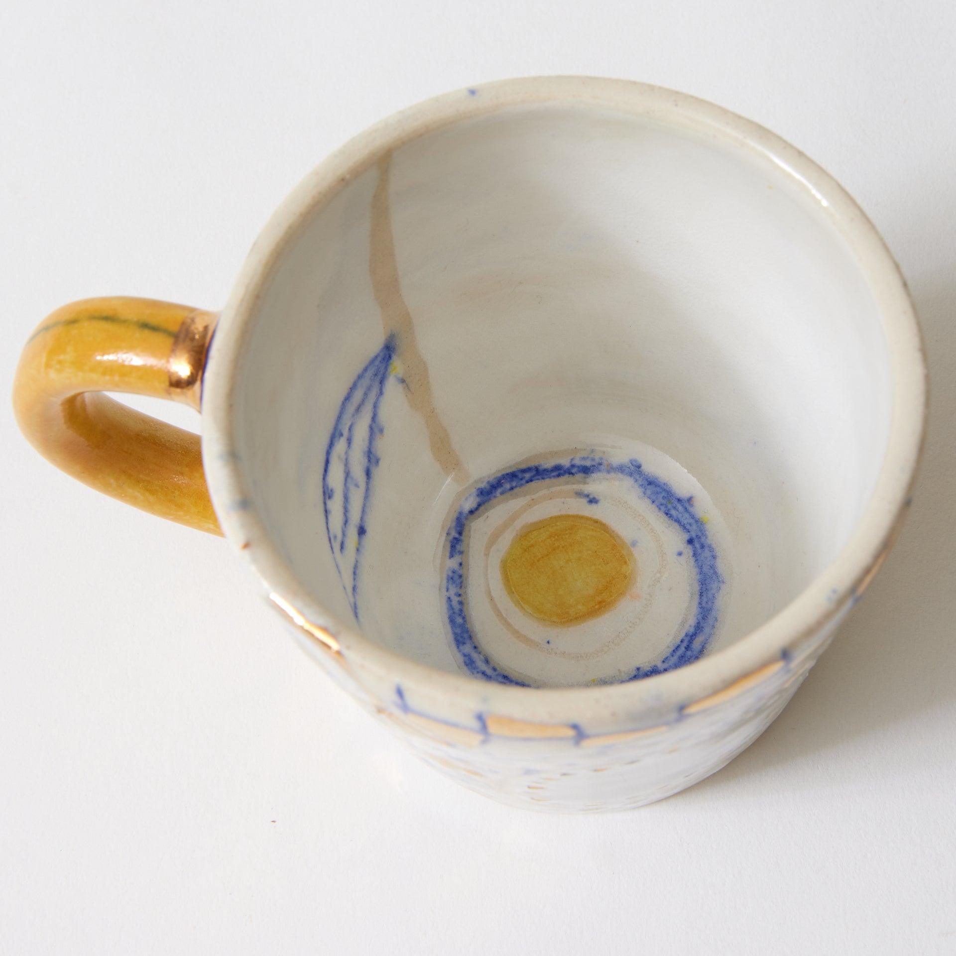 The whimsical design of this “doodle mug” is a perfect special cup for someone young or young at heart. The real gold luster adds an extra sparkle that is hard to capture in a photo and is food safe. The doodling continues on the back, bottom, and inside of this mug. Avoid microwave as the gold is real metal.