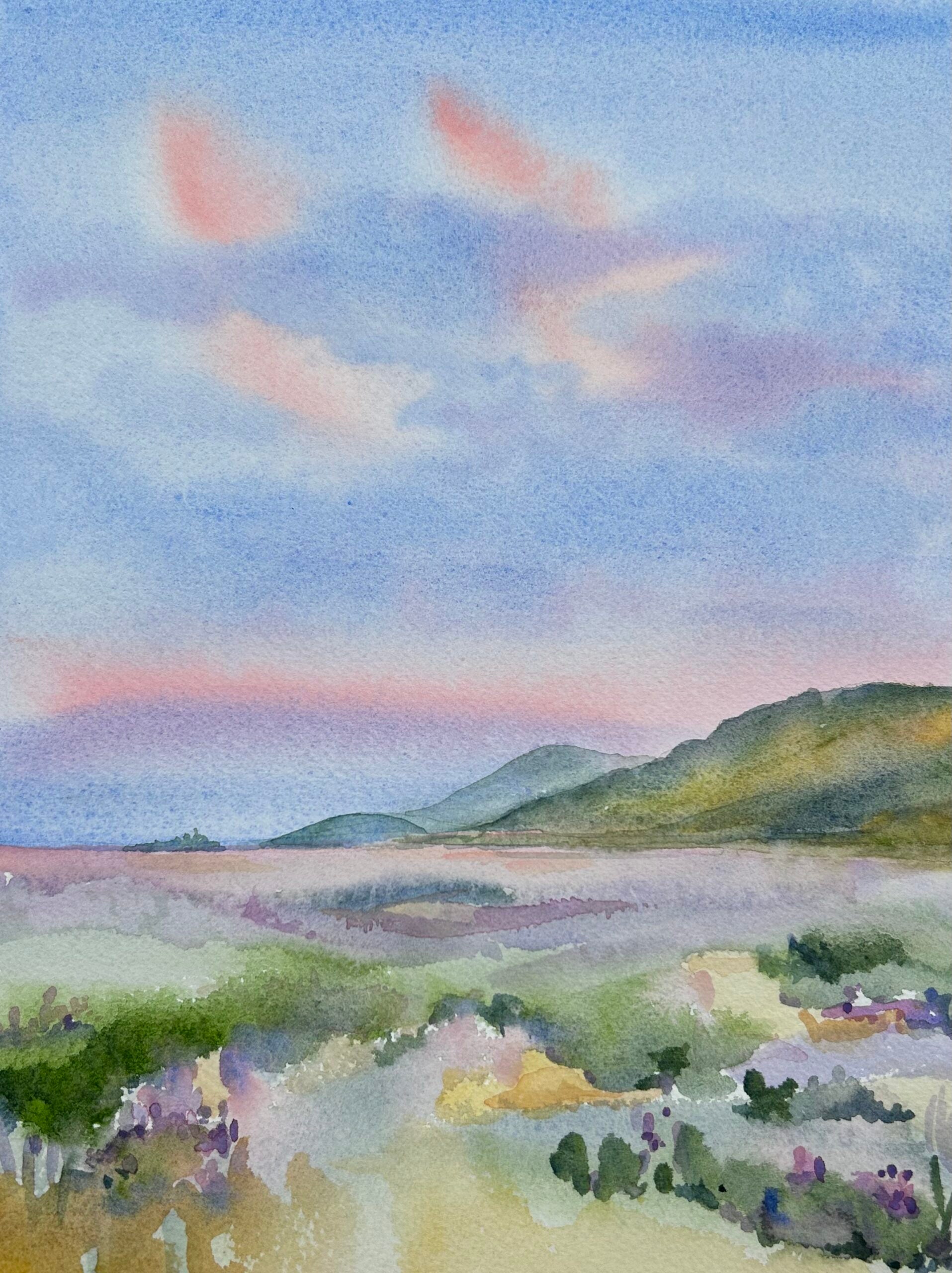 This is such a gentle color palette! The pastel colors in this landscape give me a sense of tranquility and calm. It’s loose in style, yet somewhat detailed in the foreground.