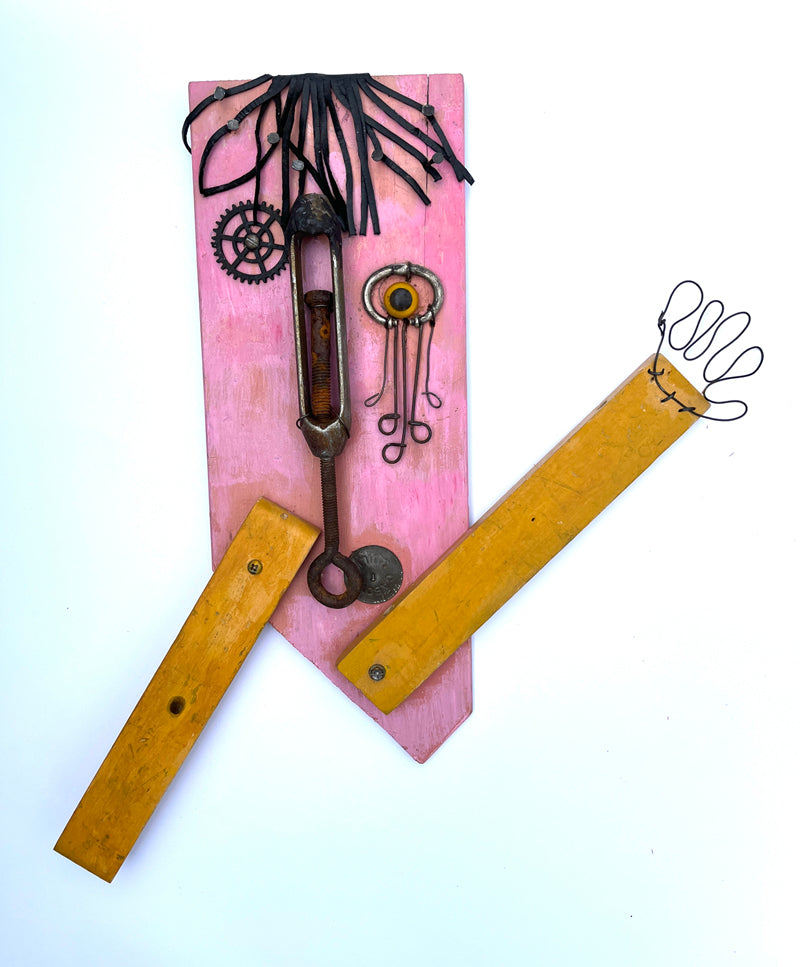On a found piece of wood....the hair is leather strips held down by small black nails. The nose is a metal turn buckle with a small thin coin as a nostril. One eye is a black plastic piece and the other eye is a metal ring with a plastic eyeball and wires hanging as eyelashes. The arms are found yellow wood pieces with a wire handcrafted hand.