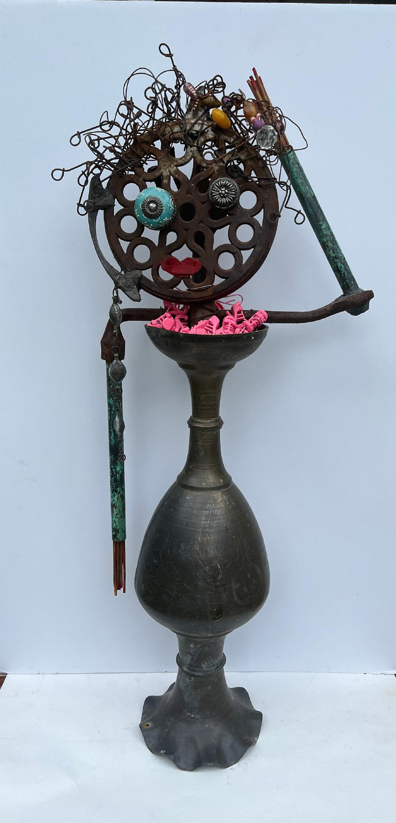 A wheel wrench acts as the shoulders. The arms are made of aged copper and fingers of thin wooden sticks with red nail polish attach to the arms. A metal trivet serves as the head attached to the body by a clawed tool. Decorative knobs are the eyes. There are beads in the hair which is made of twisted wires. The ear is made of a metal handle. A necklace of pink plastic mini high heels are shown at the neckline.