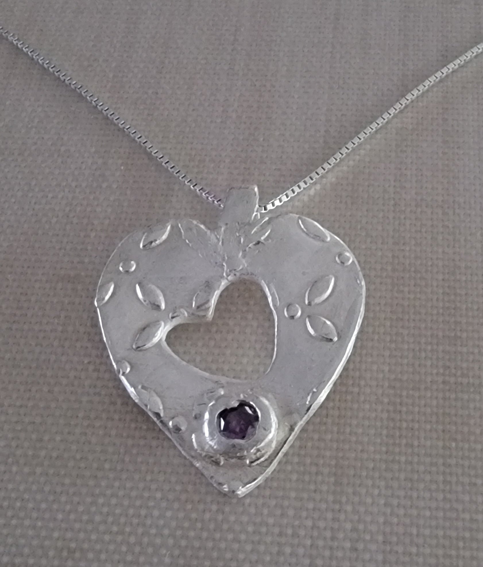 • Pure silver heart pendant with cut-out heart with amethyst colored cubic zirconium