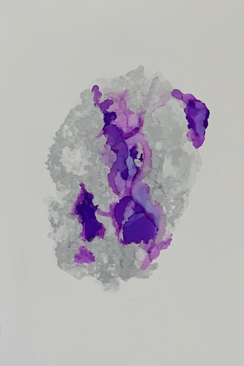 Another work from what I call my bling phase, this image is petit but packs a powerful visual punch. Melding inky silver with luscious purple (a color often associated with healing) created an image with visual heft. While the feeling of this piece is bold, the purple and its hints of underlying blue, producing a soothing effect.