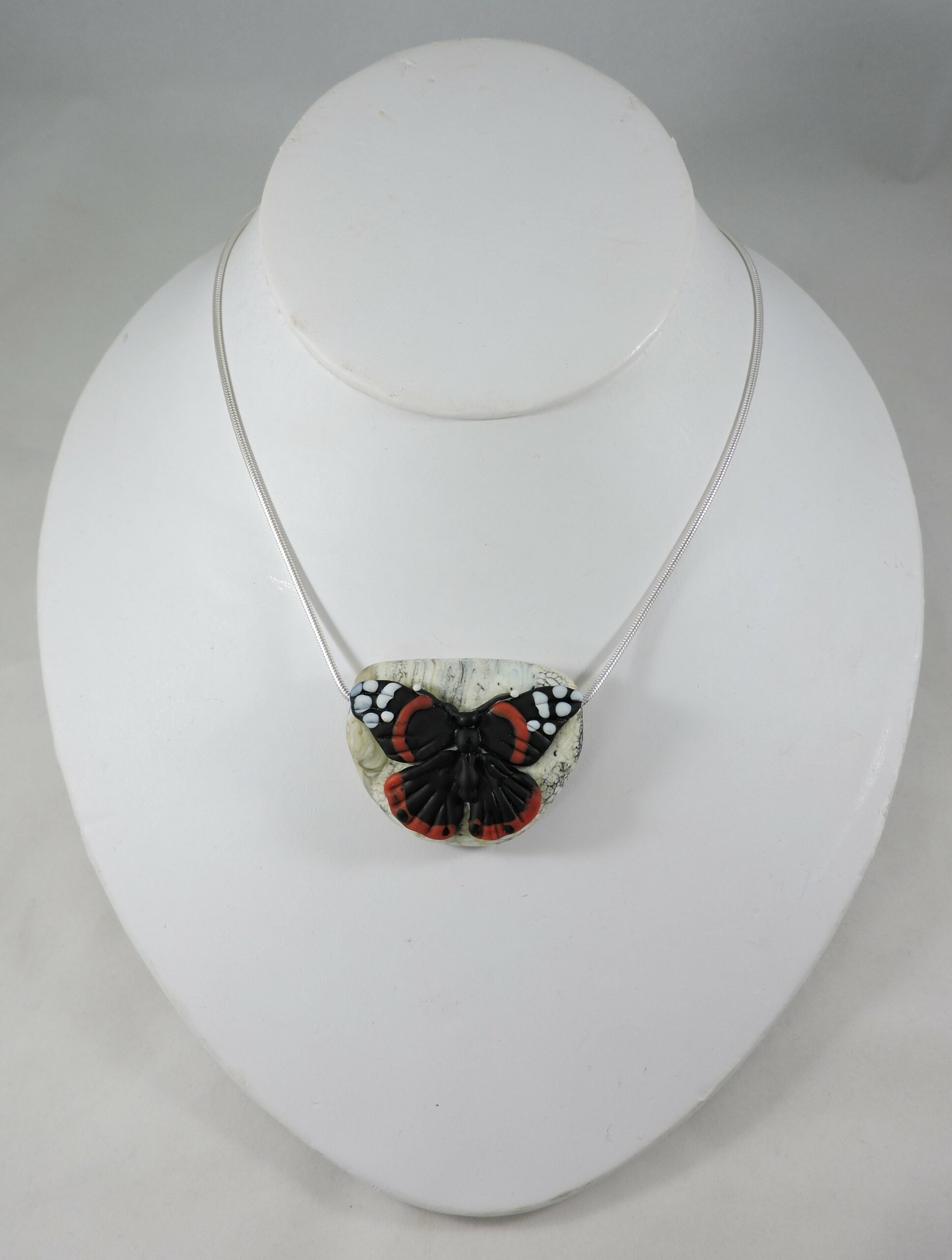 Show your love of nature with this wearable art, a portrait of one of nature's most delightful creatures sculpted out of colored glass. In a process known as lampworking, glass rods are melted over a torch. Once soft, the glass is wrapped around a steel mandrel and shaped to form the base bead. While the bead is still warm, bas relief details are painstakingly added using tiny stringers of color. When the design is complete, the whole bead is annealed in a digitally controlled kiln. Finally it is dipped in an acid etching solution to give it an all over velvety texture.