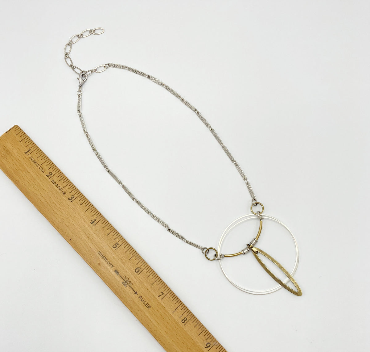 This mixed metal necklace is comprised of silver plated brass bar chain with silver and brass plated circles, curves and ovals creating a statement with a retro futurist vibe.