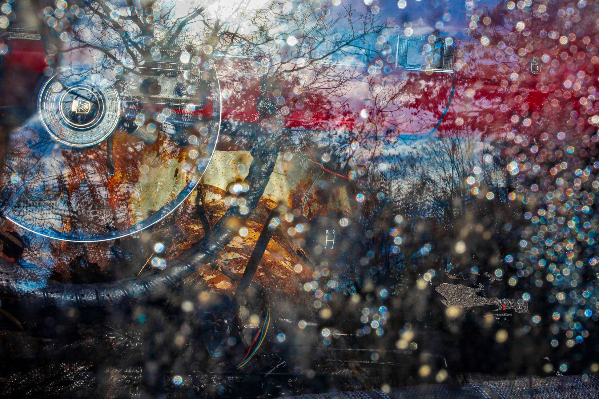 Reflections falling on the dashboard of a classic car evoke memories of road trips gone by.