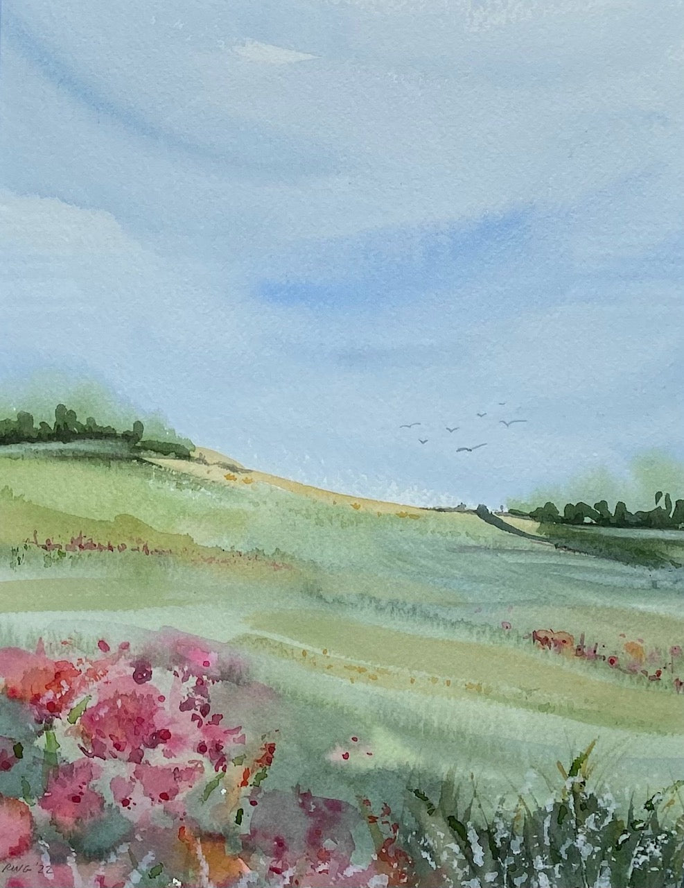 Blues and Greens with a touch of red! Look at the texture of the grass in the meadow, that's the beauty of watercolor! And I love the way this painting takes you up and beyond the horizon.