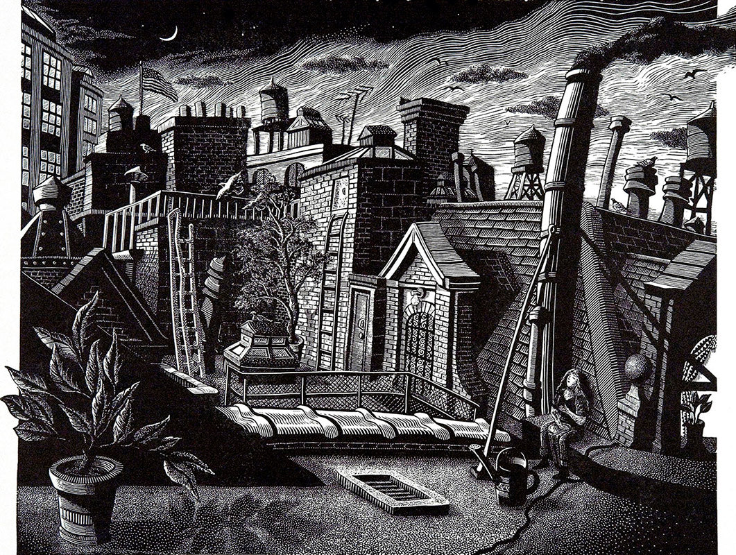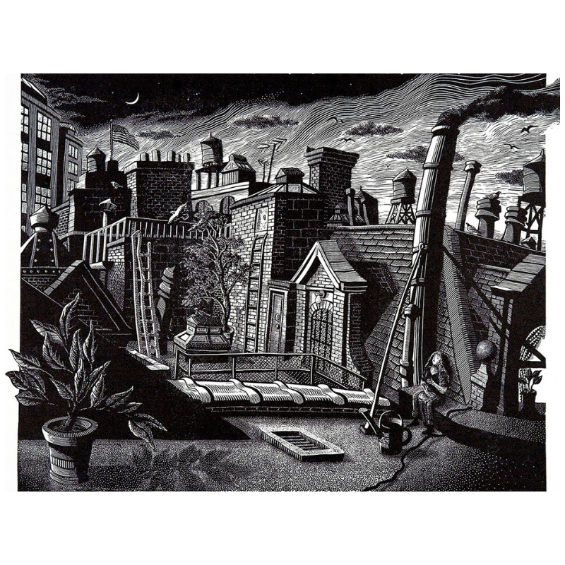 Rooftop Rhythms was sketched from life on a W. 68th St. rooftop (directly upstairs from the bedroom window from which Backyards in Winter was sketched). The woman drumming, added from imagination, is enjoying the sanctuary provided her by this blacktop retreat from the busy streets below. I very much enjoyed hanging out there myself!