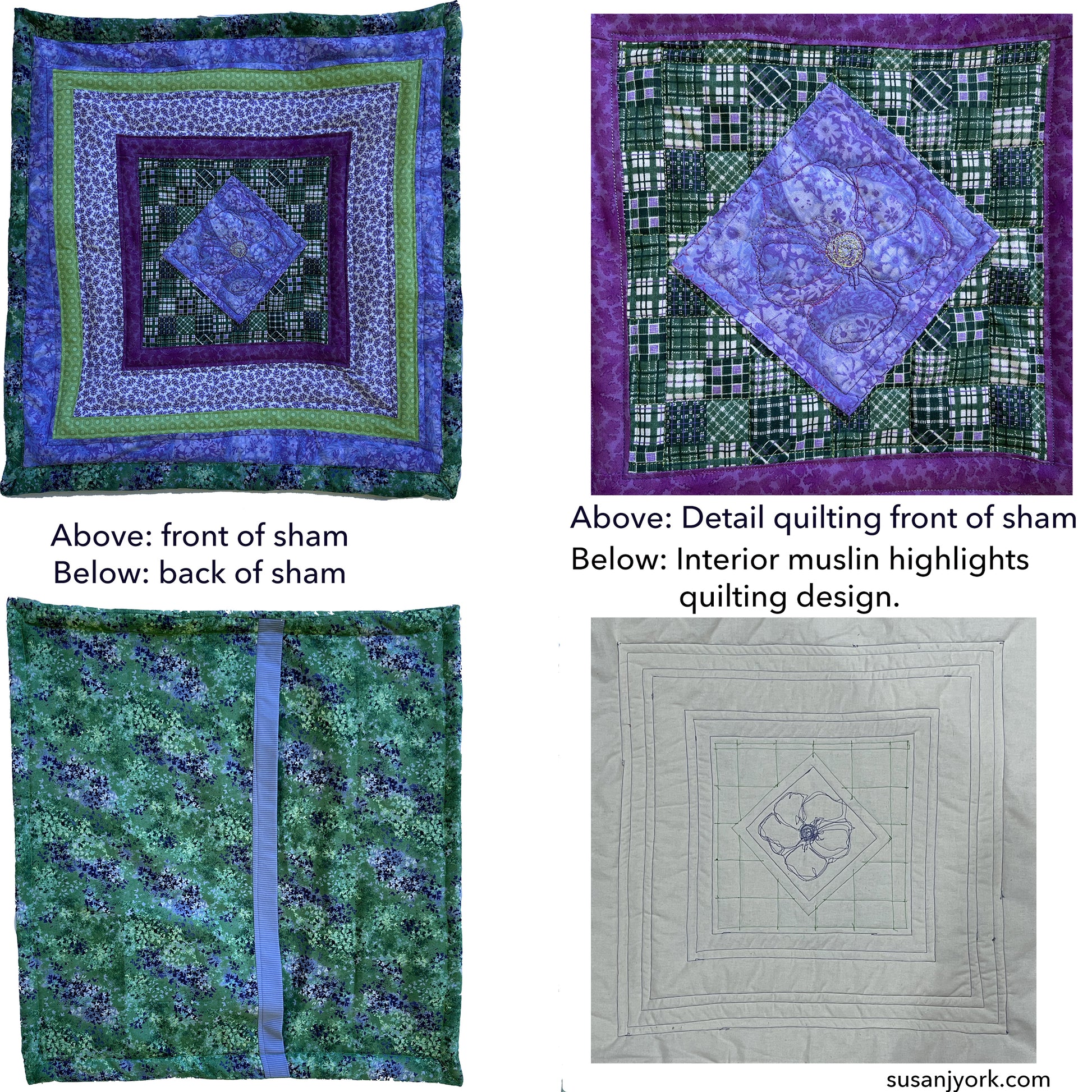 This pillow sham coordinates with the small quilt Seeds of Change. The square format shown contains a 20” x 20” pillow form (not included) It is an original pattern of concentric squares. The center appliquéd lavender diamond contains a free motion quilted flower in a purple thread with a pale green center. The concentric squares are quilted with rows and checks as you can see from the interior muslin backing inside the pillow. The back envelope closure has a lavender binding