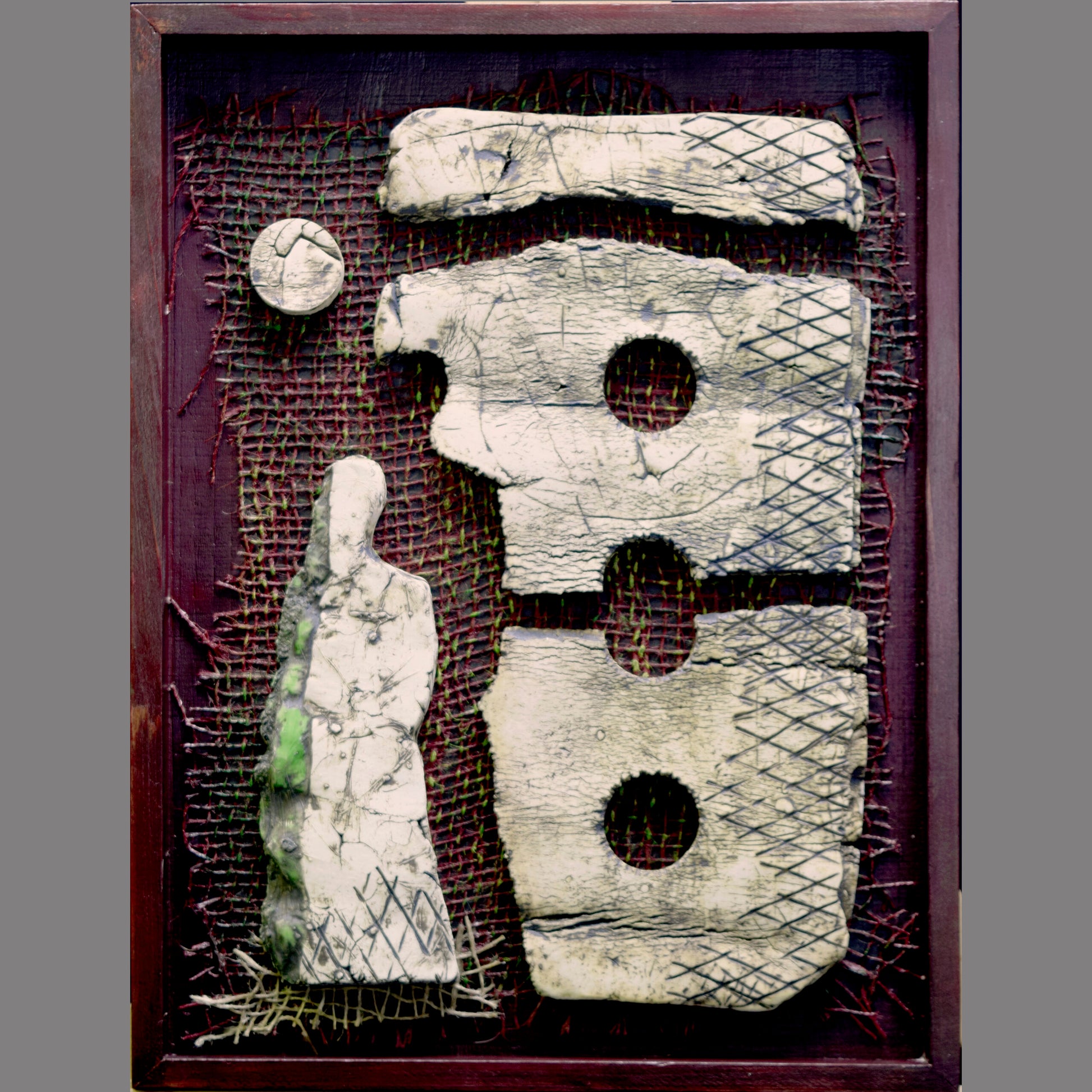 This ceramic sculpture features a Vigilante breaking away from a crumbling wall, with three empty spaces where moons already were separated, with one visible in the distance. The earth tones and textured surfaces evoke a sense of detachment and transition.