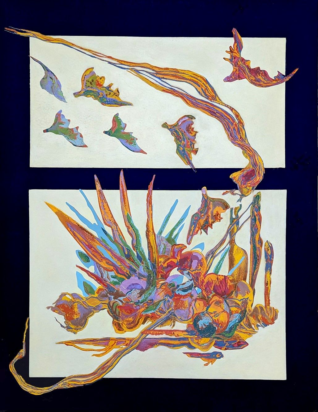 "Setting Forth" began its life in the early 1970's as a simple pen and ink drawing of onions and the knives which slice them. Later I turned the drawing into various multi-colored silk screen prints which by the 1980's had been cut up to inhabit a diptych called "Leaving Home." It traveled to Jerusalem to be with my sister and her husband, (Paul's brother). When, more than 30 years later, the family returned to the States and gave the piece back to me, I put it in a closet where it stayed until 2024 when I enriched it by adding more bird-like forms, and all the light blue and violet. I exhibited it with its present name in a Poughkeepsie gallery. As both referential and non-objective forms show up in this piece, it is emblematic of both sides of my artistic life which has matured since I first set forth.