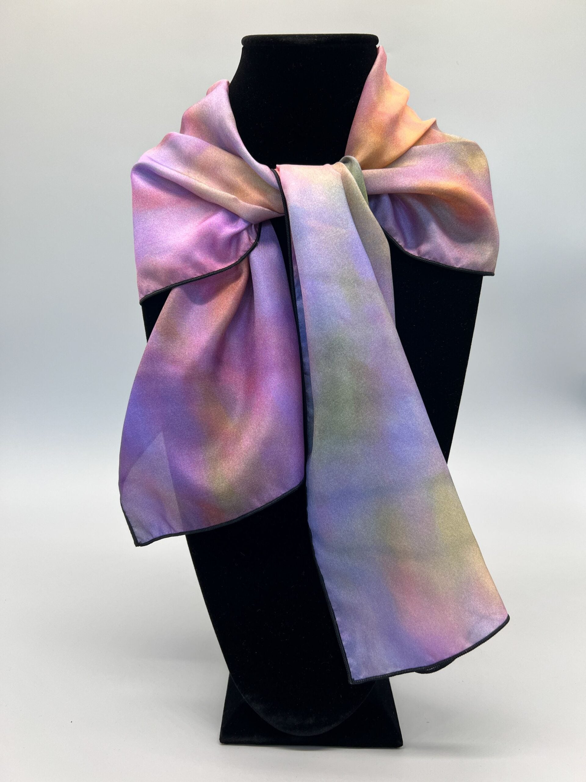 Scarf made from 100% silk habotai and finished with a machine rolled baby hem.