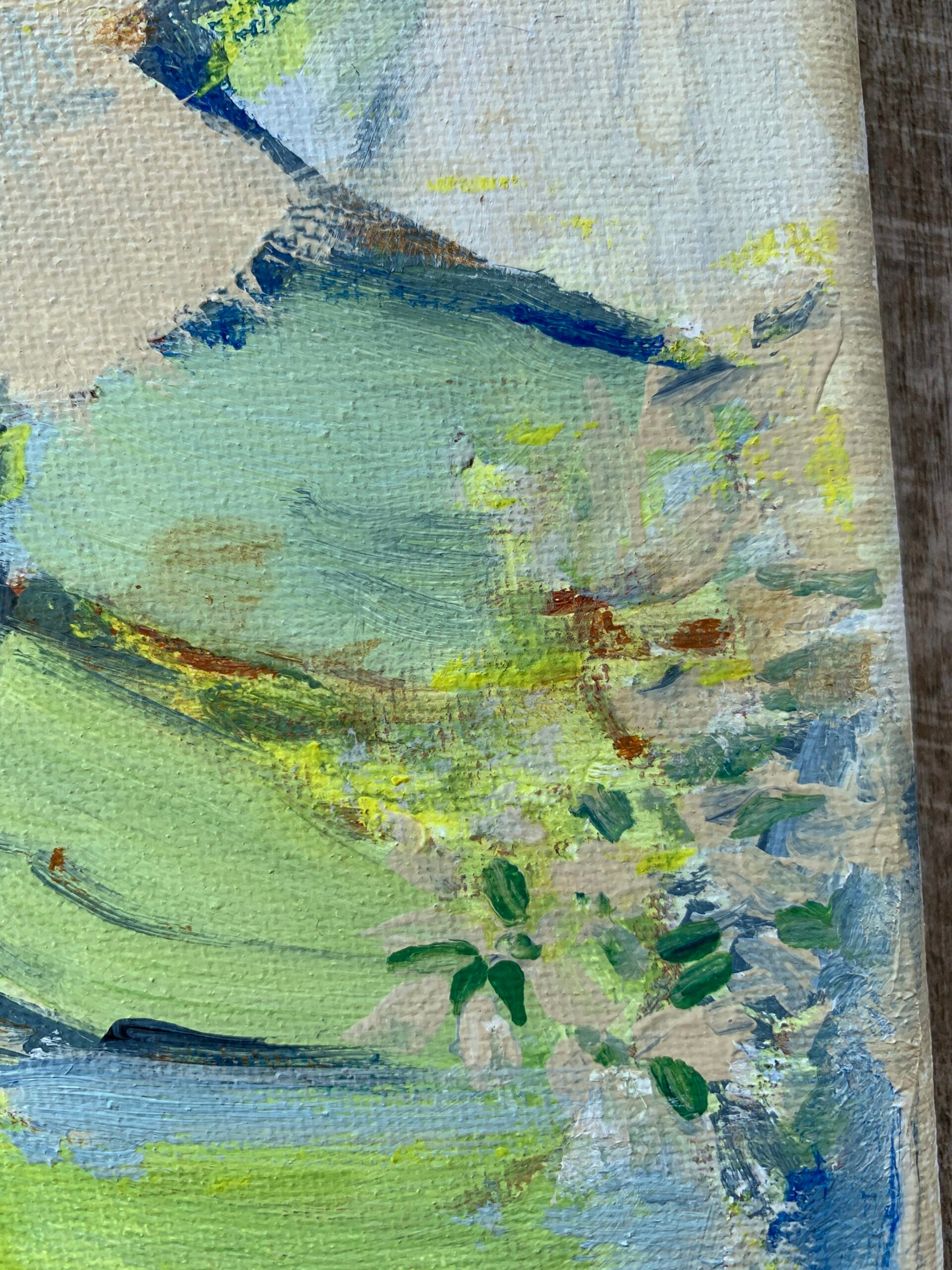 “Shifting Reflection” is square abstract expressionist acrylic painting with smooth patches and sweeping linear brushstrokes in blue, green, yellow, and golden tones with highlights of white. Paint is applied with brushwork and palette knives in varying textures and lines creating directional flow and subtle organic shapes and markings throughout the painting. The painting is unframed, with white painted sides so framing is optional. The artist's signature is on the reverse. Contact Sharon Dee for commissions and inquiries at sharondee1@gmail.com