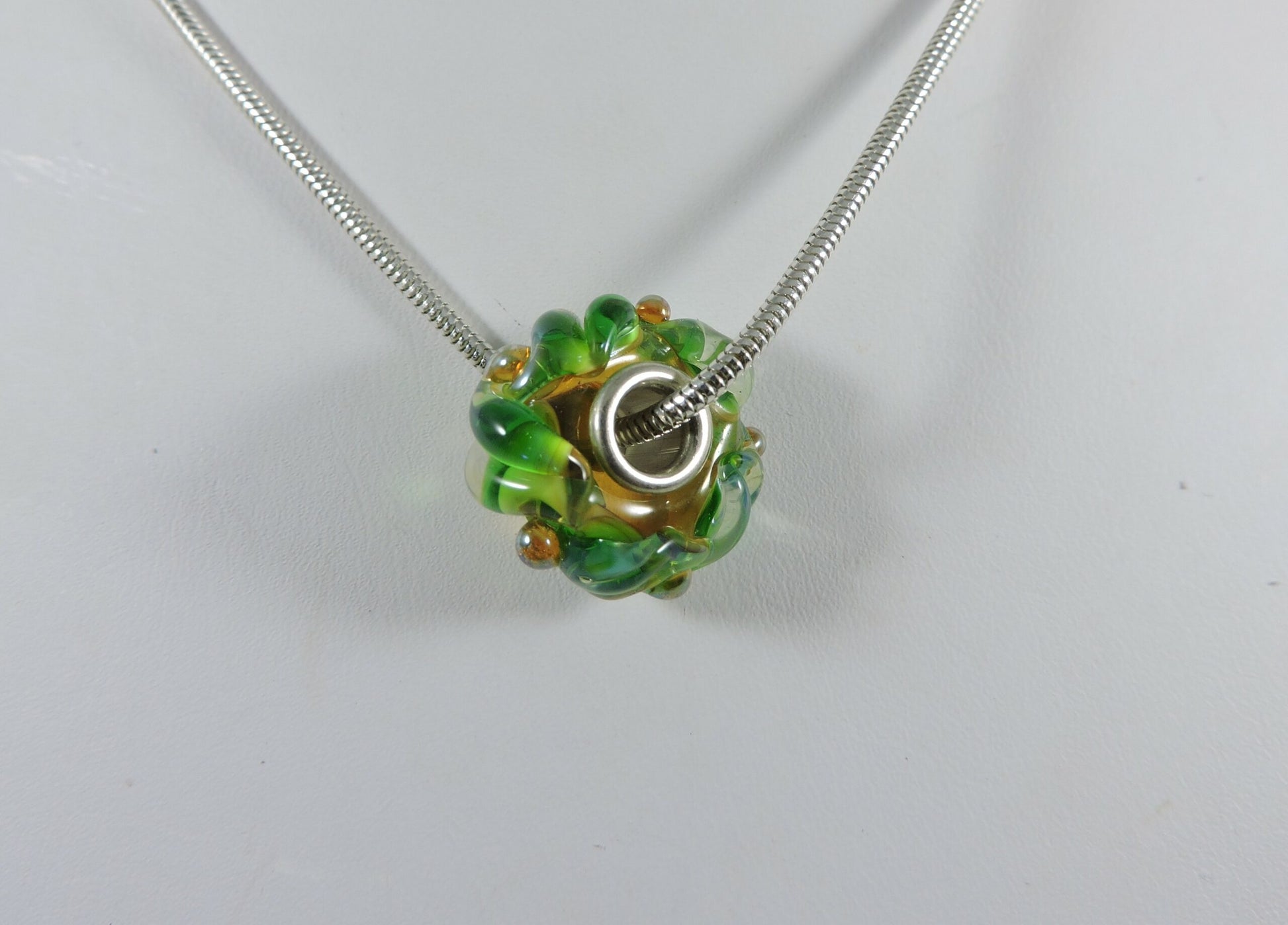 A charming green leaf pattern circles the silver core of this pretty bead. After the amber-colored base bead is formed, the leaves are placed around the perimeter. Then a swirl is made by piercing the space between each leaf and twisting it with a thin glass stringer. Finally a reduction flame is used to bring the silver to the surface of the glass. As an added bonus, this bead will fit most Pandora and Troll style bracelets.