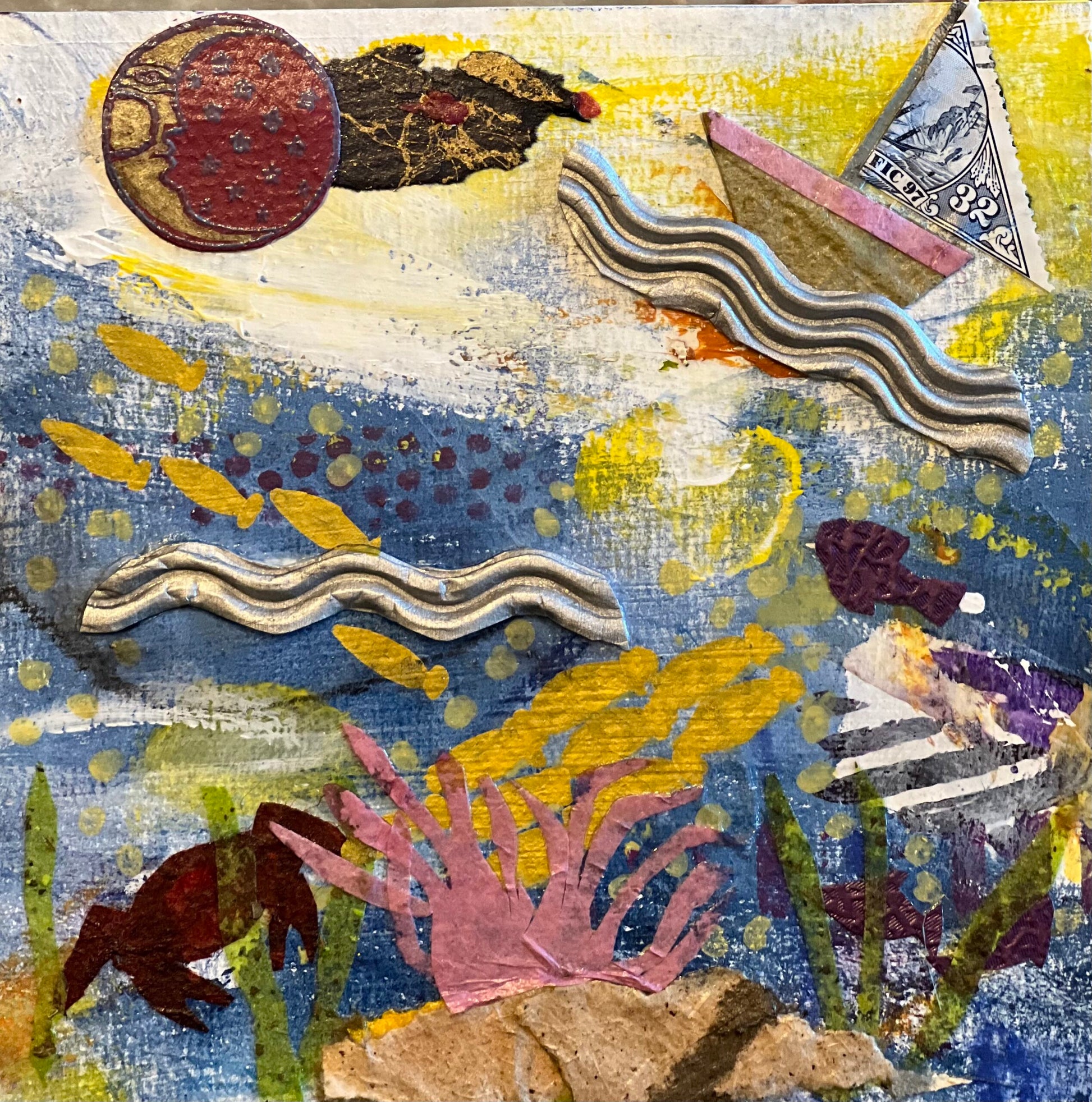 I started with a large piece of paper and painted with acrylics using large brush strokes, then g more details with art sticks, soft colored pencils etc. The collage was then created as a final layer using scraps of textured papers and acrylic paints.