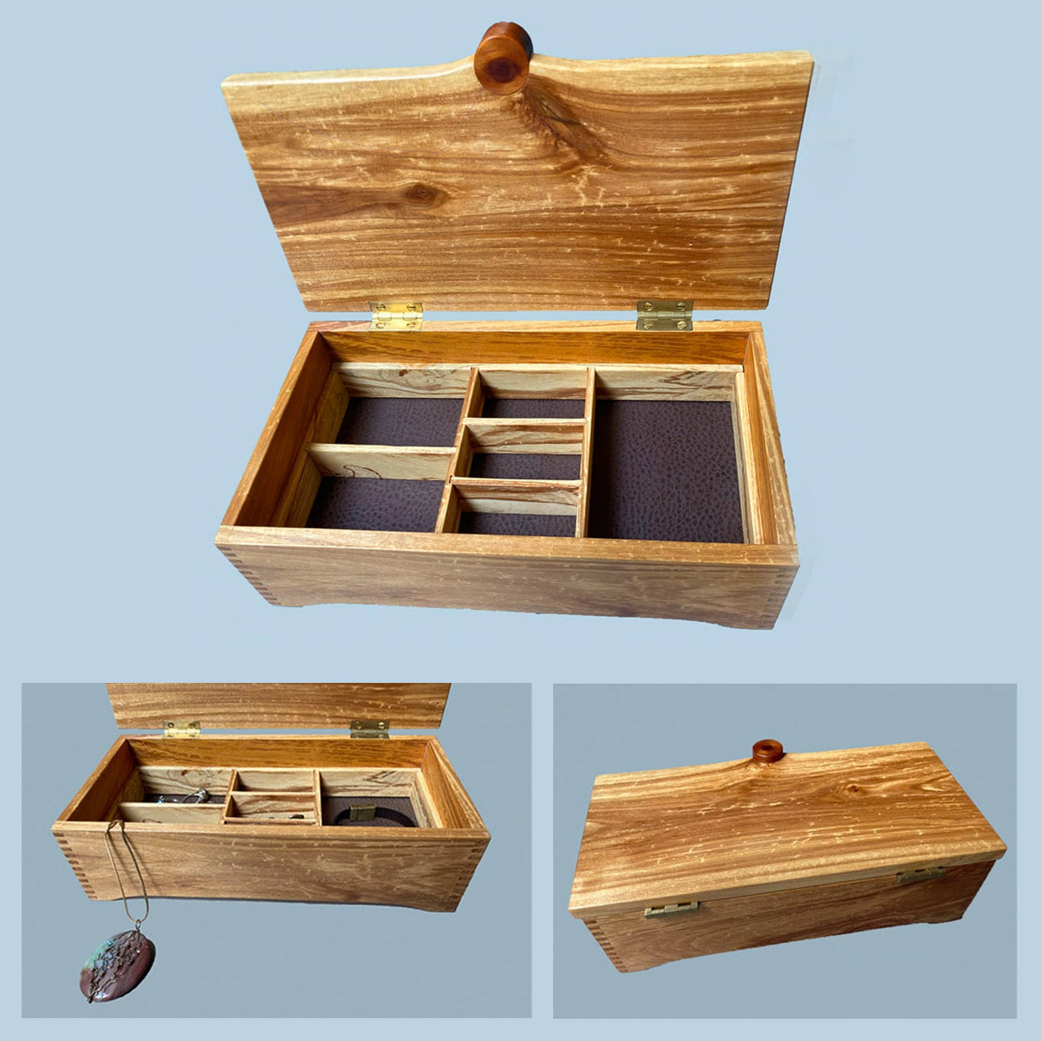 This at once rustic and elegant box is a perfect repository for bracelets, earrings, cufflinks, or an endless array of keepsake items. Compartment dividers in the leather-lined floor can be selectively removed to accommodate specific item shapes, and solid extruded brass hinges hold the lid open at a 95-degree angle. As the photographs show, the lid is contoured with a gentle sweep in front that echoes the natural sweep of the wood's grain. The inset raised mahogany knob contains a small dark knot that accentuates the box’s overall style. The joinery is meticulously executed finger joints, and the box has a multi-coat satiny hand-rubbed finish that is both water- and alcohol-resistant.