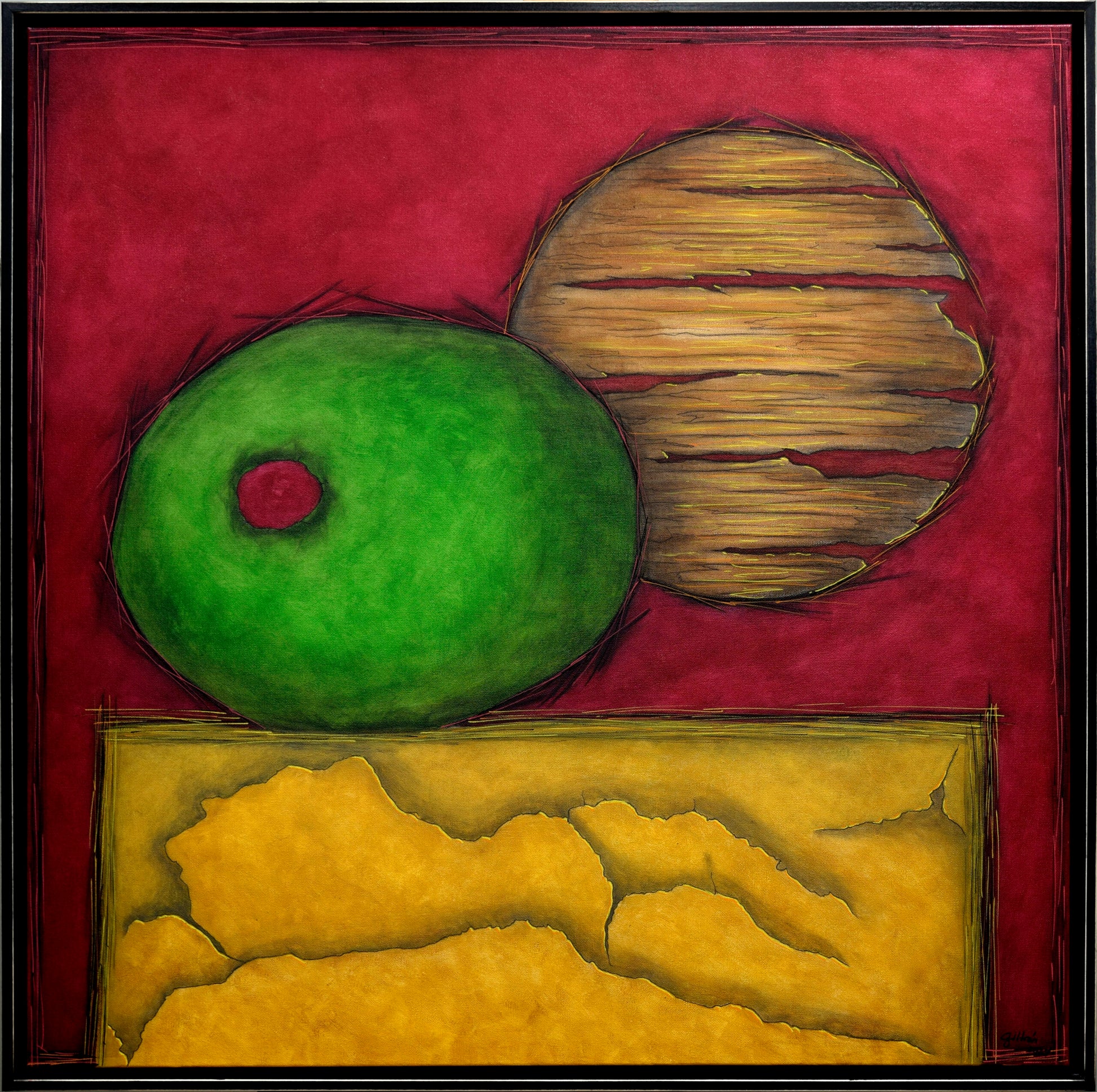 In this colorful painting, a texturized, highlighted moon takes center stage, with a storm brewing beneath it and an organic green oval figure hovering above the chaos.