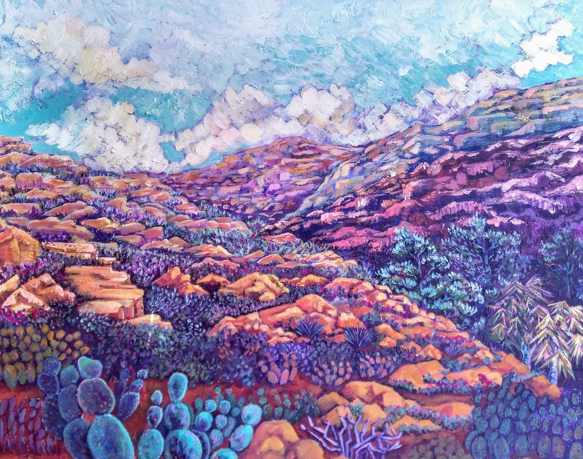 Southern California. The clouds in the distance bring promise of moisture in this dry, rocky terrain. The colorful rocks are like gems in the bright sun.