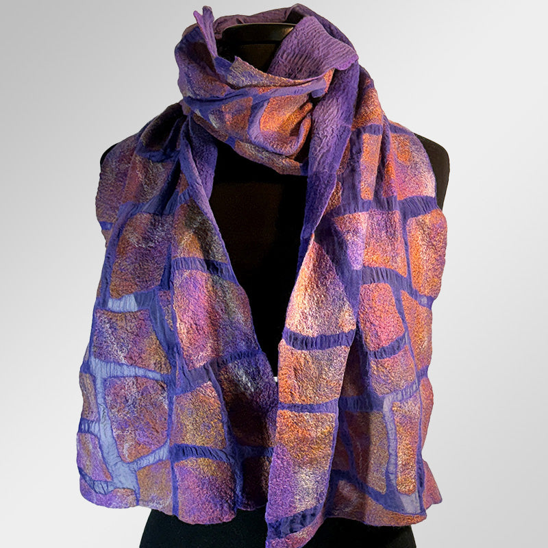 A nuno felt scarf on a rich purple gauze base. It features a textured, mosaic like pattern in sunrise hues. This versatile scarf can be worn across seasons.