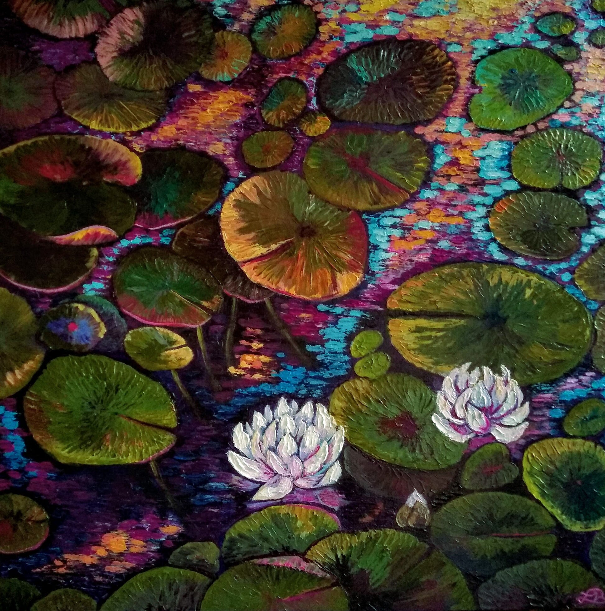 This is one of my favorite pieces. I love the contrast of the dark water and the colorful reflections. This is a vibrant statement piece. The sun sets over the lily pond, casting brilliant reflections on the surface.