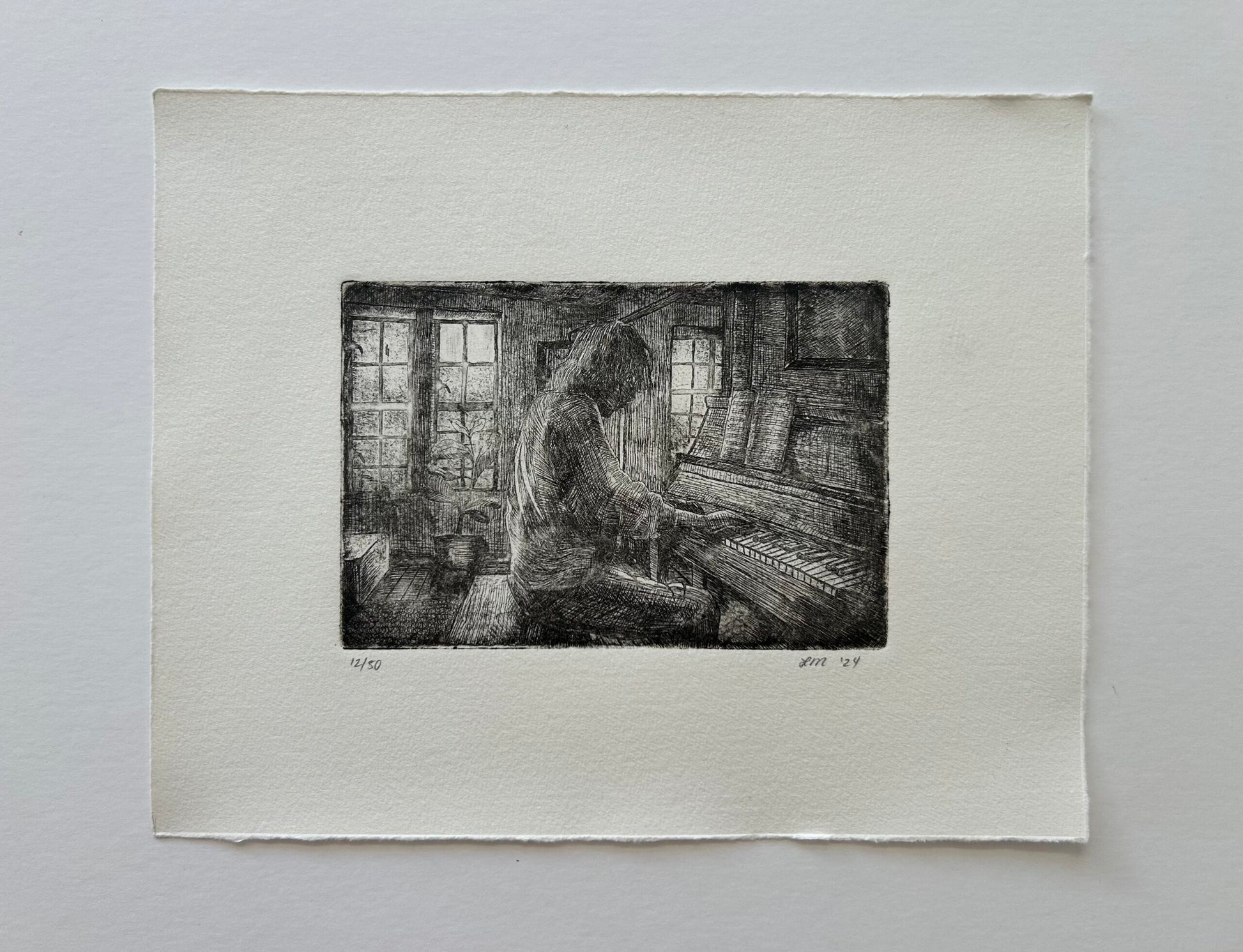 This etching depicts a figure playing piano in a dark room, only lit by afternoon light. This is a melancholy piece where you can almost hear the sounds of the piano playing from the streets below this small New York City Apartment.