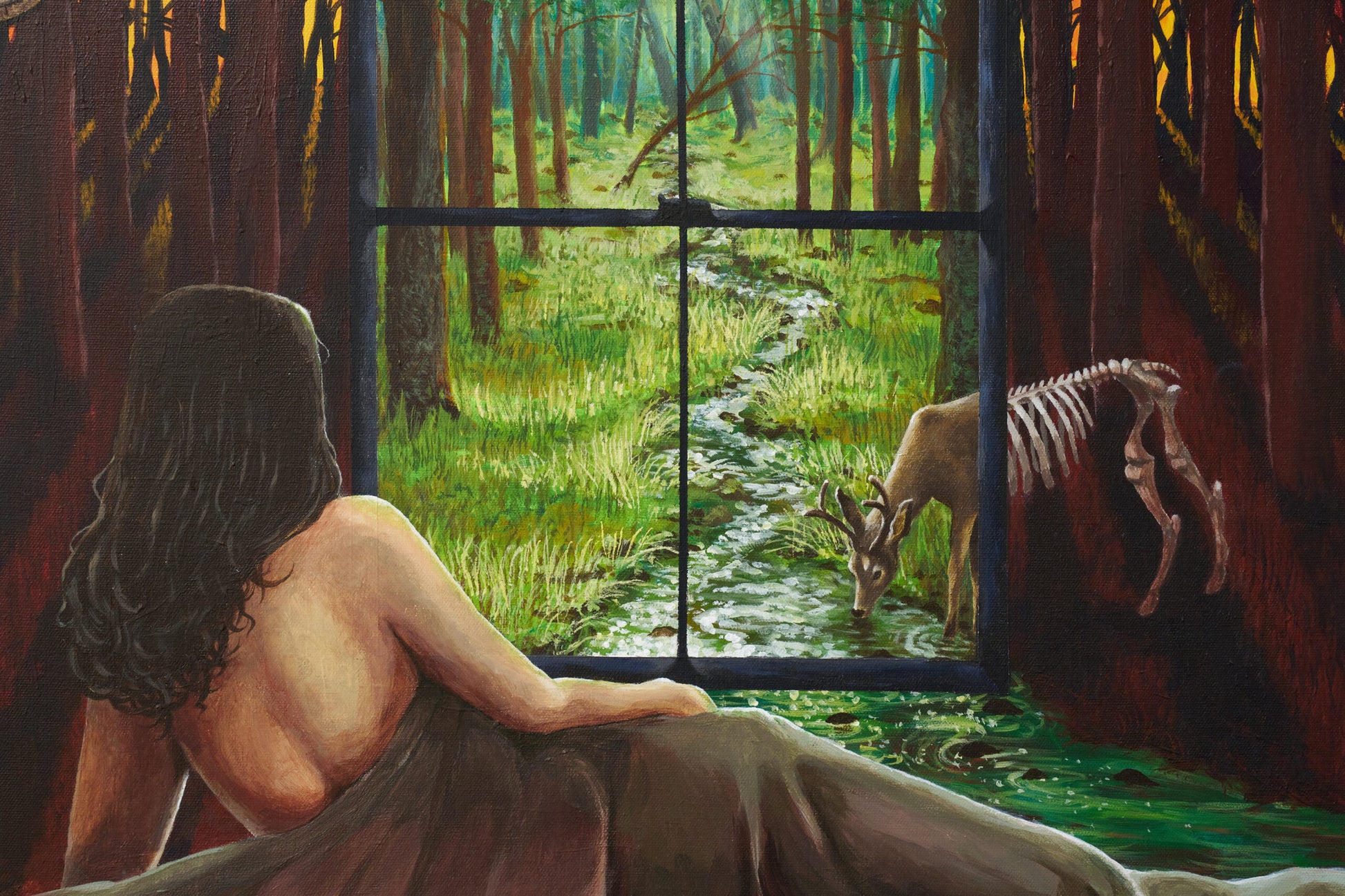 This piece was made with acrylic paint on canvas, and I used references from places in nature that I visit often, and a friend as my figure reference.