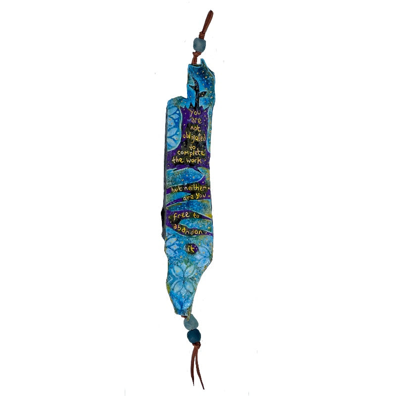 This is a light-weight hanging sculpture with the image of a tree stump with shoot and and the phrase from jewish wisdom "You are not obligated to complete the work, but neither are you free to abandon it." These relief sculptures came into being as a way to work with forms from nature and emerge from the straight edges of the canvas. This piece is designed to be light and easy to hang,, and are well suited to smaller spaces individually or larger spaces as a group.