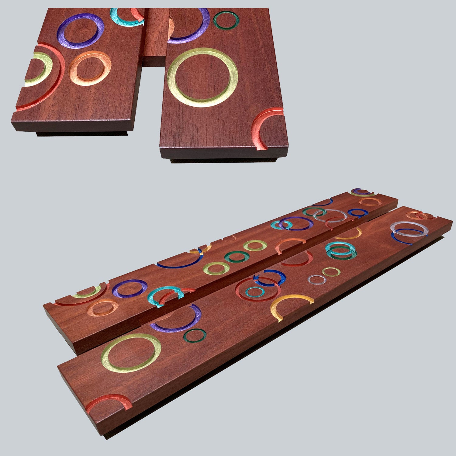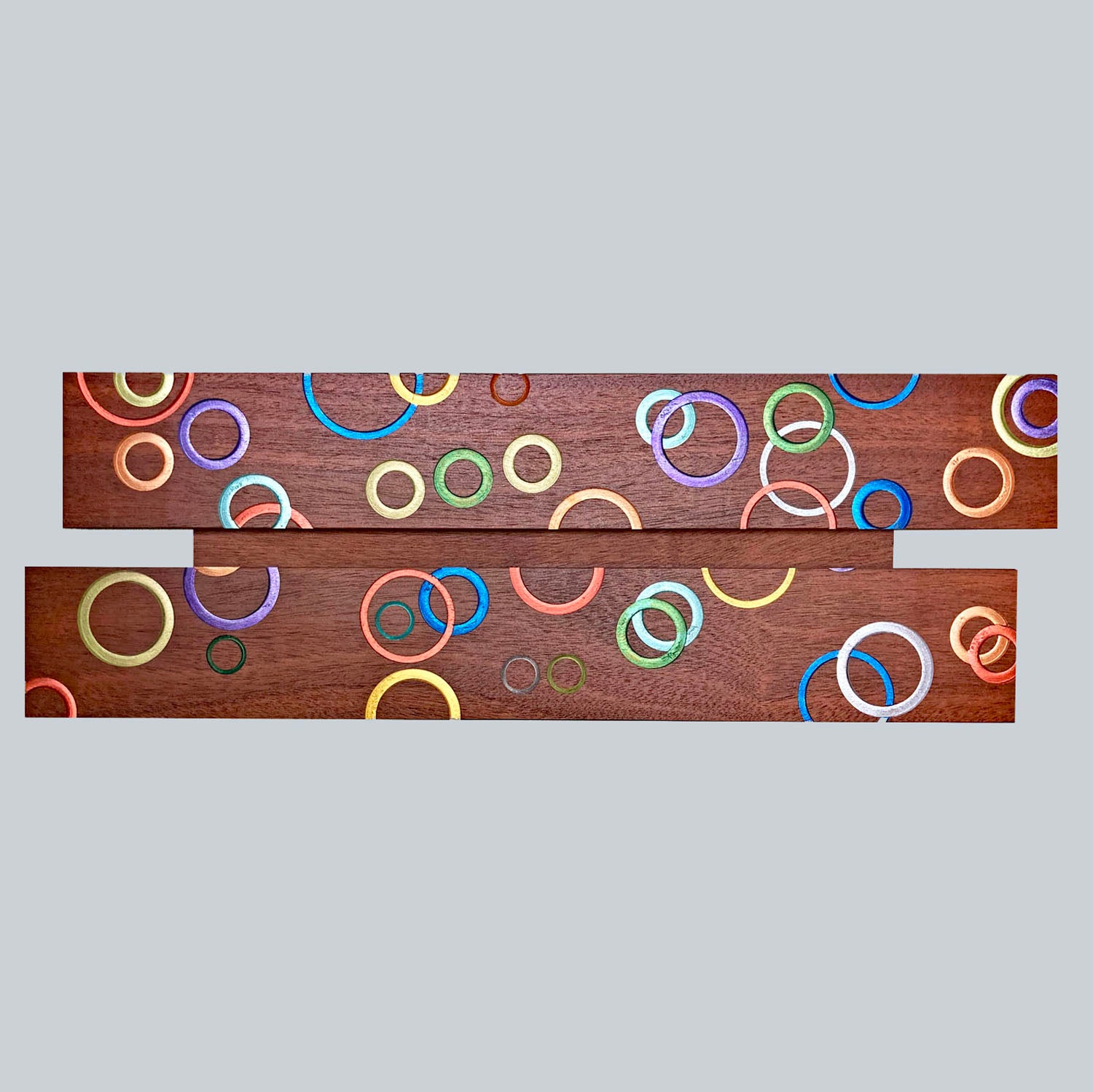 Color, color, color! This fun wall art showcases two heavily carved planks of dense mahogany. They’re carved with circles—bubbles, I say--of different sizes and thicknesses, all set aglow with bright acrylic opalescent paints. The planks are mounted on a mahogany base that makes this piece appear to float on the wall, casting shadows in all directions. The rear of the base contains two sliding keyholes so that you can mount “Too Many Bubbles?” either vertically or horizontally. Simply put a nail or screw into the wall, insert its head into one of the keyholes, and slide the head along the keyhole channel until your piece hangs straight.