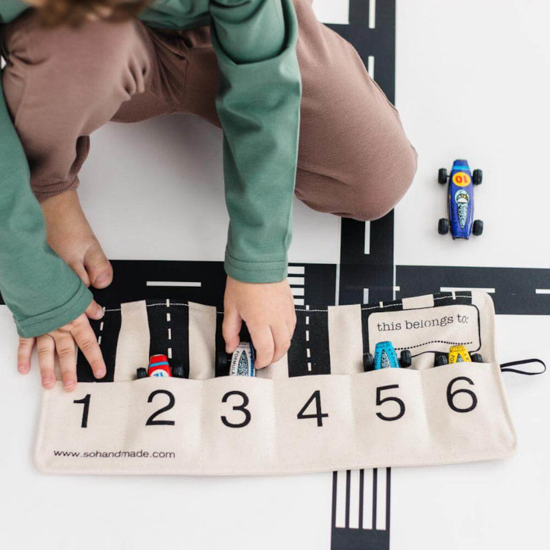 Never lose your child’s beloved toy cars again. With handy storage pockets for up to 6 toy cars, our best-selling toy car organizer storage bag doubles as a road-patterned play mat when open—perfect for quick and portable entertainment. Roll everything up into a compact bundle that fits in your bag when your kid’s done. Happy driving!