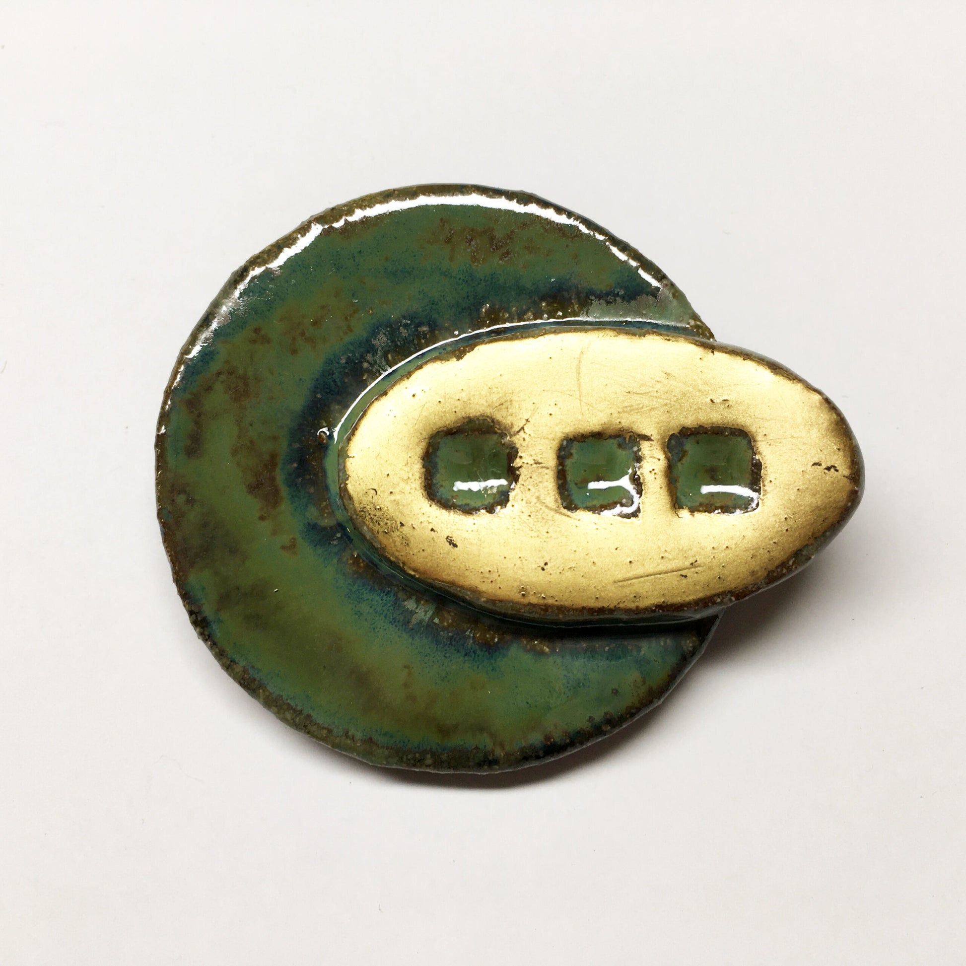 TRANQUILITY PIN is a dimensional art pin embellished in layered glazes and gold leaf. The pin back is clean finished with leather.