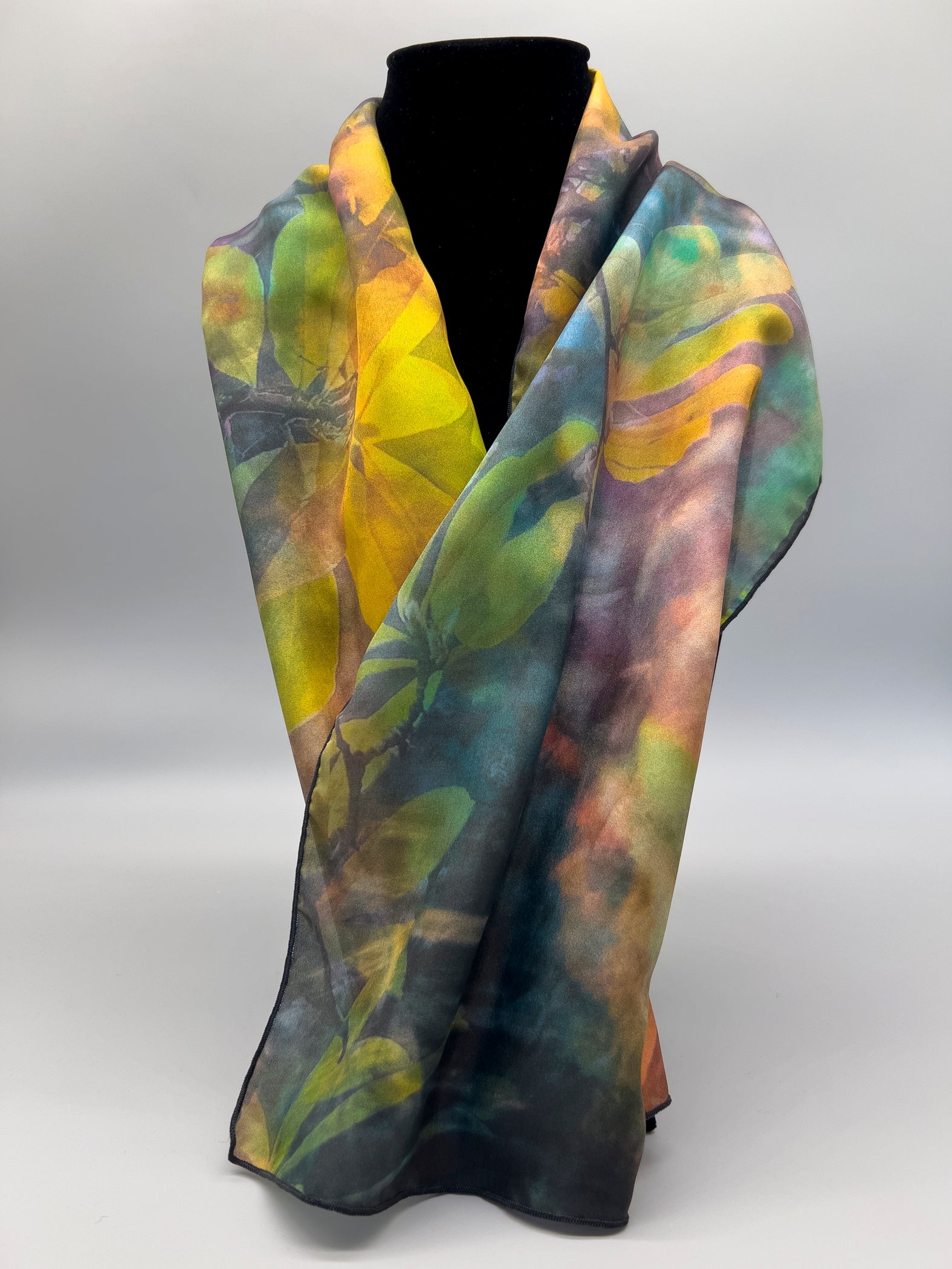 Scarf made from 100% silk habotai and finished with a machine rolled baby hem.