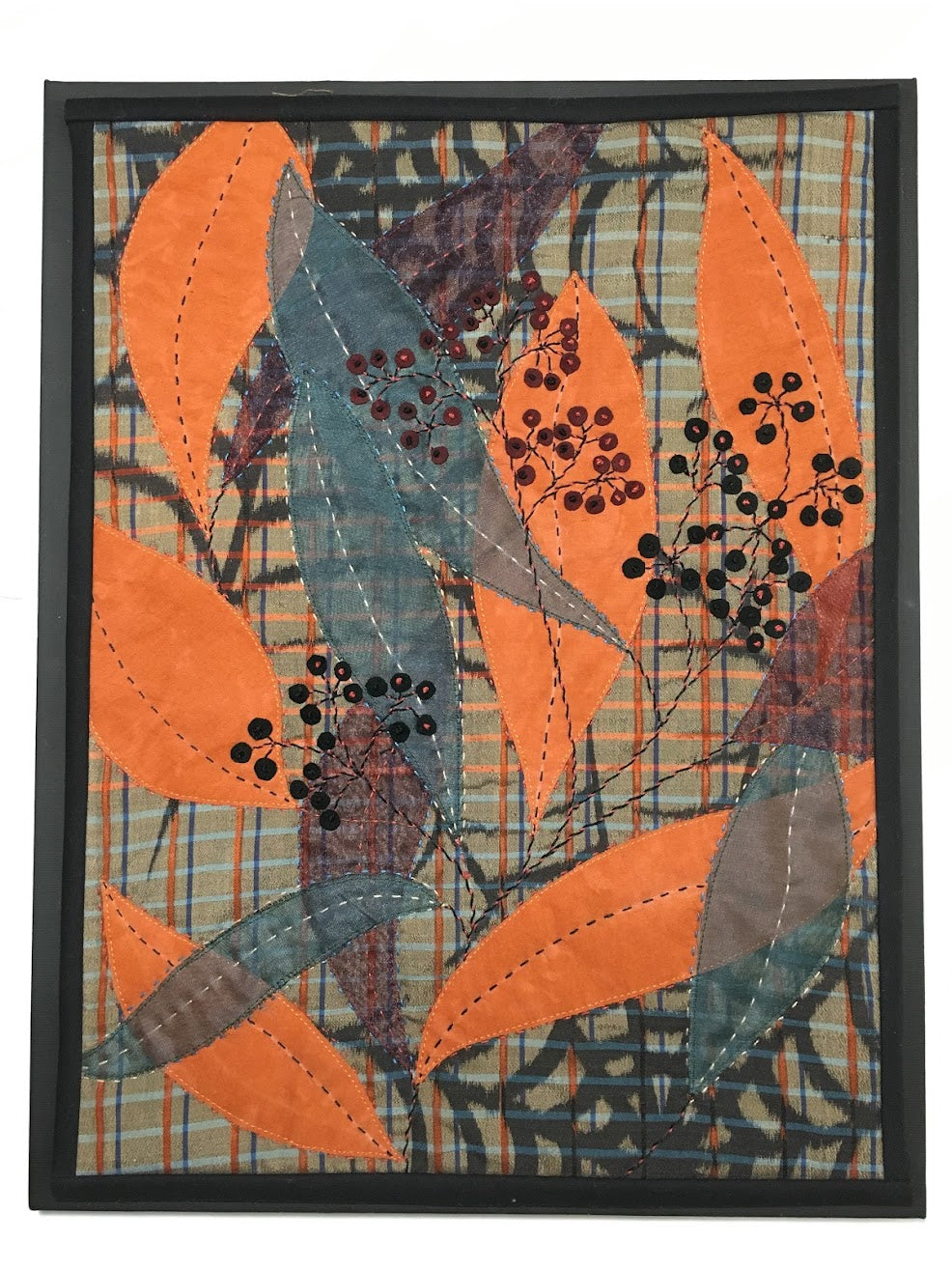 Appliqued onto a background of a vintage silk kimono remnant, this piece features leaves that are overlapped and hand stitched, with little ultra suede berries. The colors are soothing and draw one's eyes into the landscape.