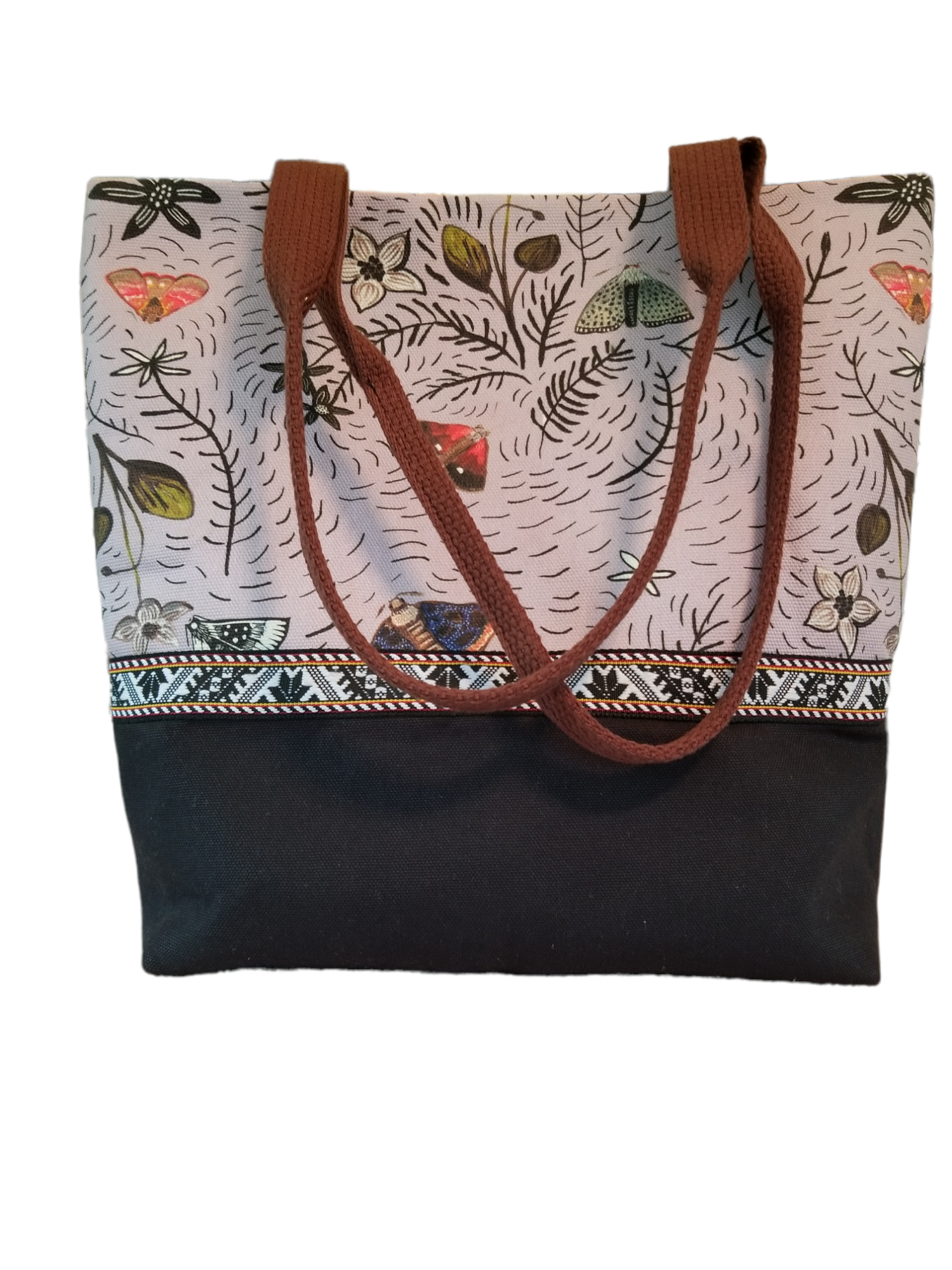 Featuring moth images, this one-of-a-kind tote/shoulder bag comfortably holds - a lot! It can be used when out and about to carry all your necessary items and small purchases. It's also handy for carrying or storing tablets, laptops, books, crafting and artist supplies, etc. The cotton webbed handles are rolled for carrying comfort. This tote can stand upright on its own.