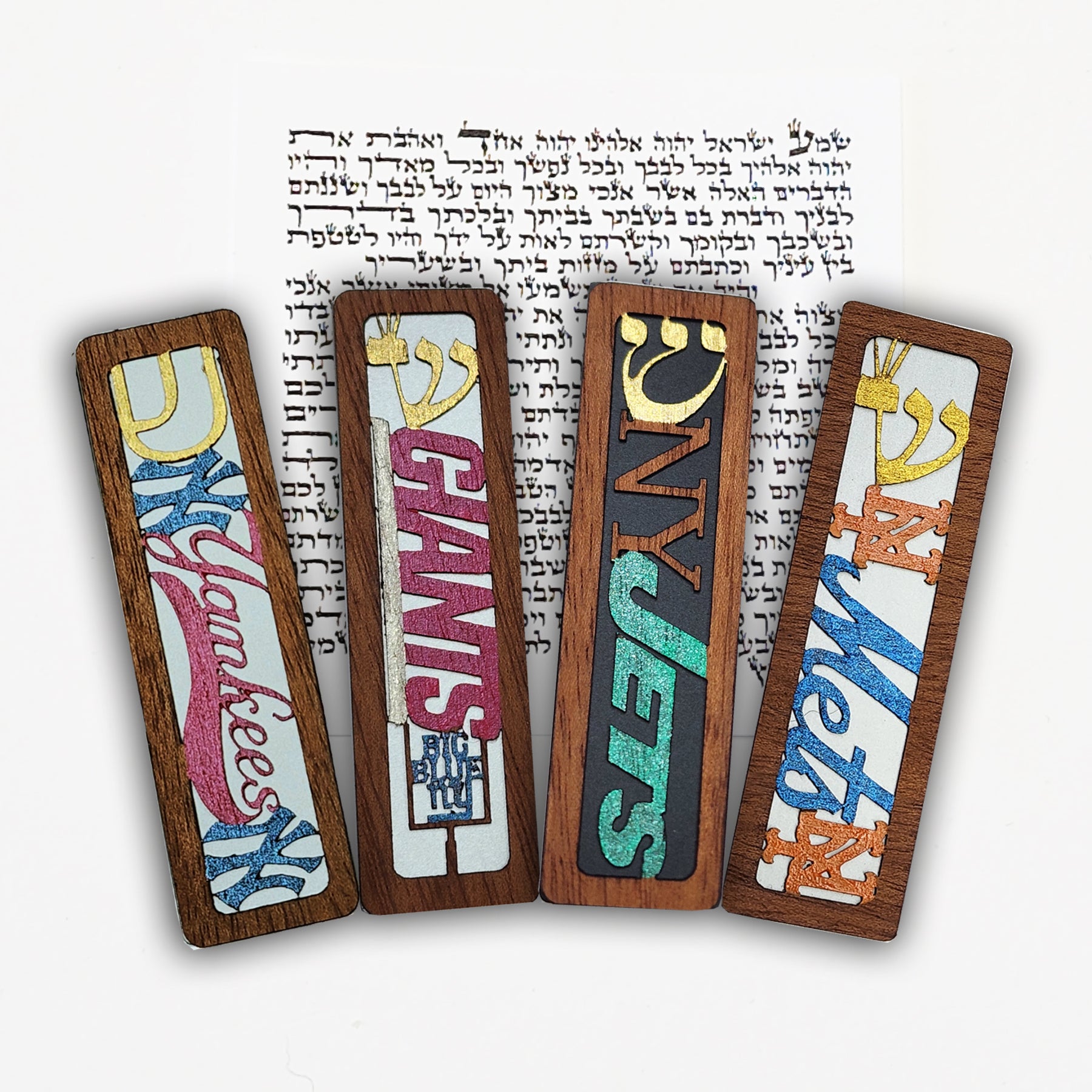 Included with all of my Mezuzot are a non-kosher scroll and a gift box. High quality anodized aluminum base. The design is made from walnut wood and hand painted. Each piece measures 1" x 3.5" with four of my most popular New York sports designs; Mets, Yankees, Giants & Jets.