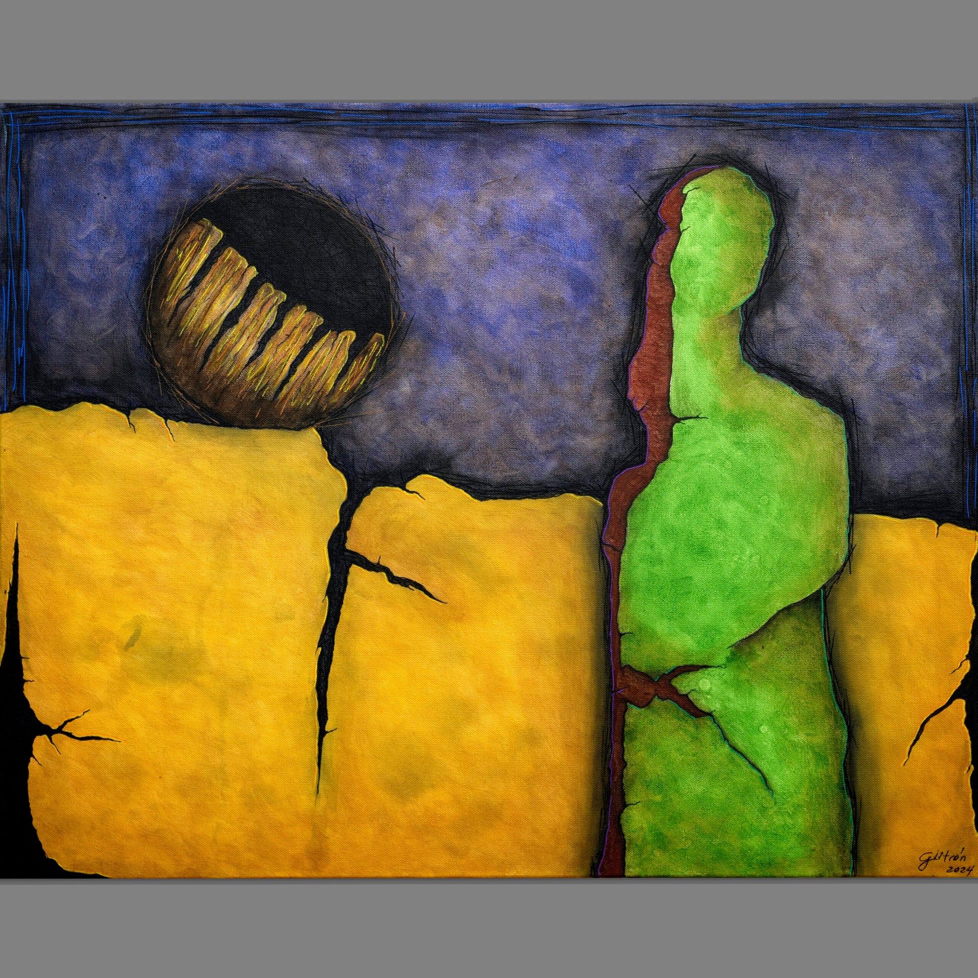 In this earth-toned painting, a solitary vigilante stands watchfully, with an eclipsed moon resting atop a cracked wall. The textured wall and dark moon create a somber and contemplative atmosphere.