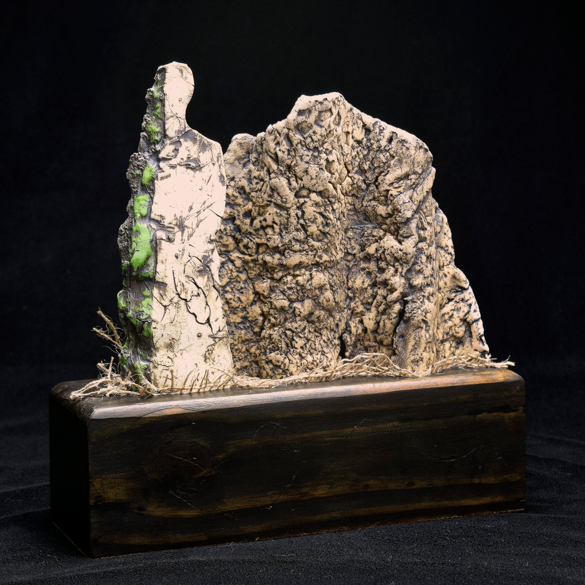 This ceramic sculpture features a vigilant figure standing resolutely in front of a mountain, all rendered in soothing earth tones. The textured surfaces and natural colors evoke a sense of strength and connection to the rugged landscape.