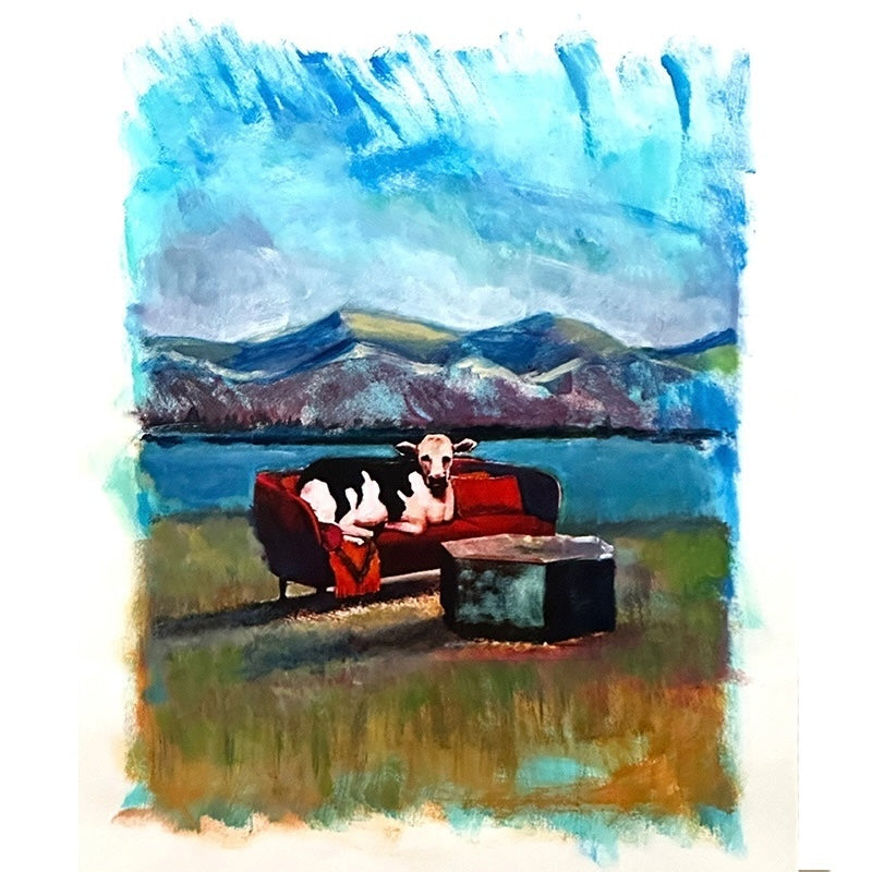 This is another in my series of paintings titled: "Waiting For Merlot." While the setting for my oil painting in slide #6 is a moody indoor scene, this acrylic work is outdoors. The air is cool, the mountains have a coating of frost, the river is cold. My cow...patient, contemplative, and maybe a little chilly on her red, mid-century modern couch...waits interminably for her favorite wine to be delivered to her table. In "Waiting For Godot," Godot never comes.