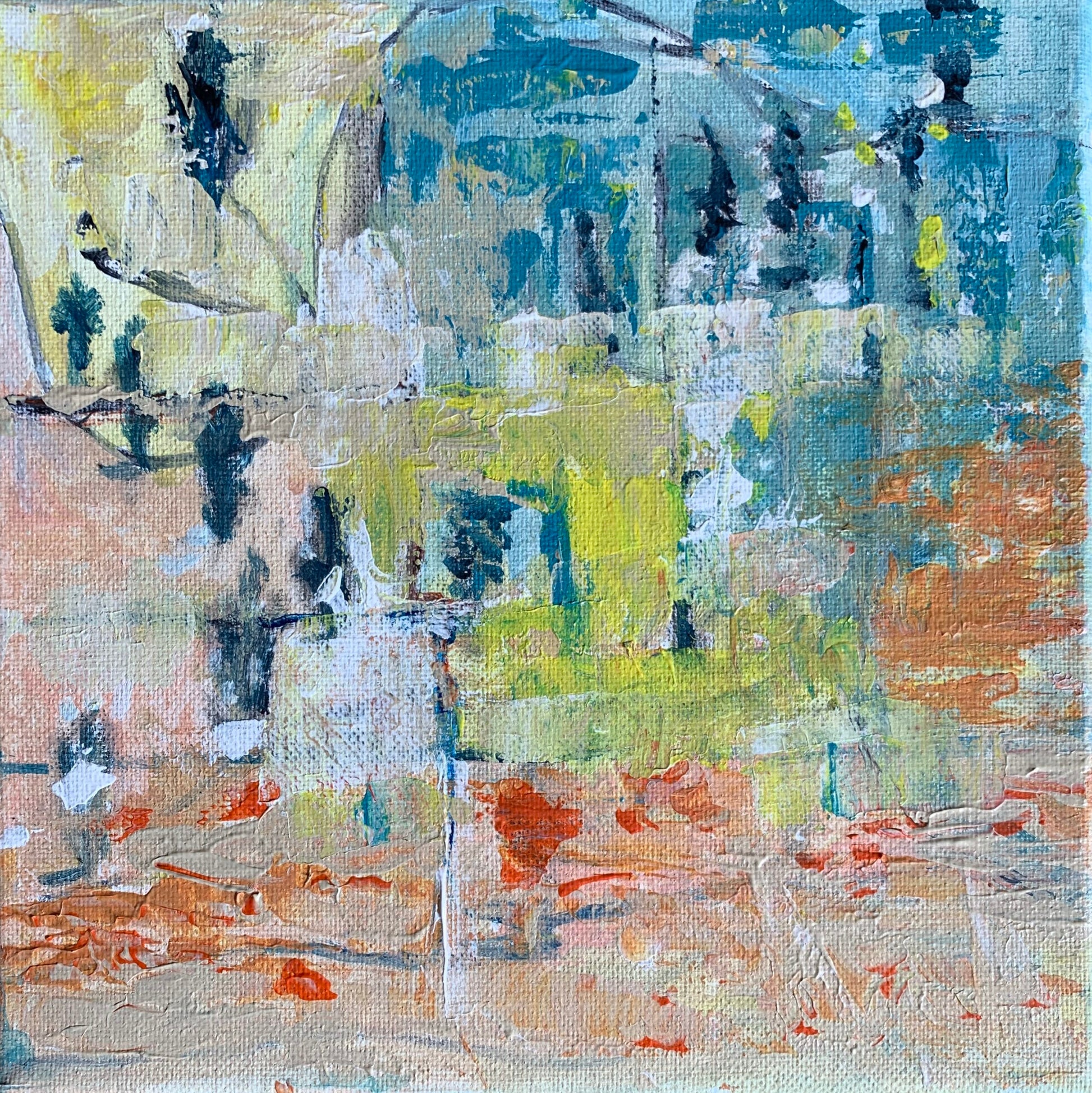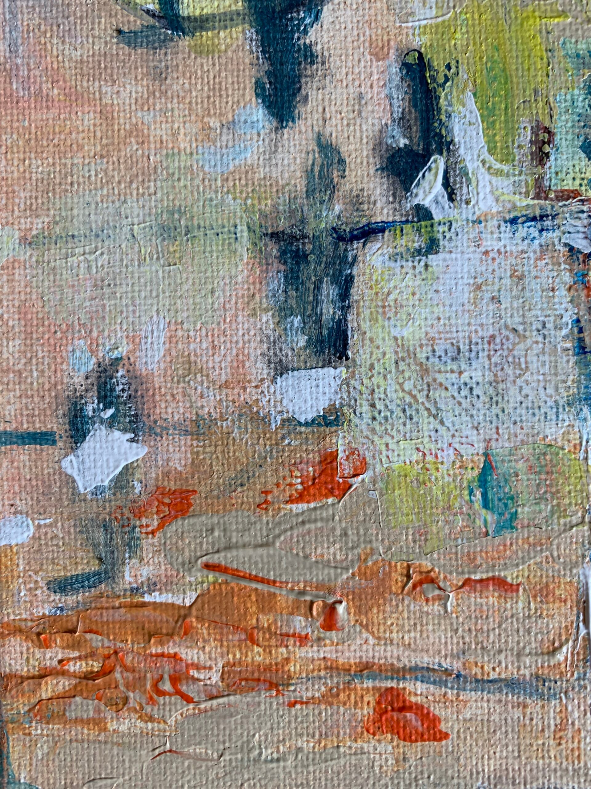 “Water Flows Through” is square abstract expressionist acrylic painting with dappled and linear brushstrokes in fresh vibrant tones of yellow, sky blue, coral, dusty- pink, bright fiery orange, black and white. The bright markings pop against a subtle pale parchment-yellow background. Paint is applied with brushwork and palette knives in varying textures and lines creating different elevations throughout the composition. The painting is unframed, with white painted sides so framing is optional. The artist's signature is on the reverse. Contact Sharon Dee for commissions and inquiries at sharondee1@gmail.com