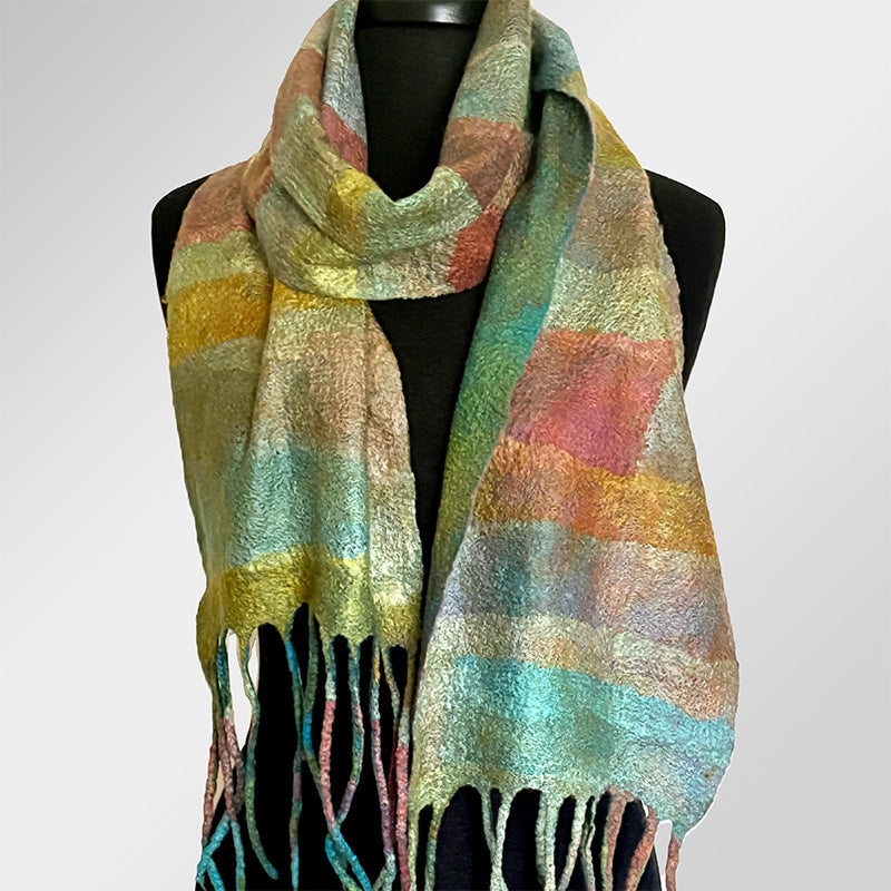 A lightweight felted scarf with irregular bands of soft colors on one side and a melange of darker teals and greens on the other. It is finished with long, elegant fringes and drapes beautifully.